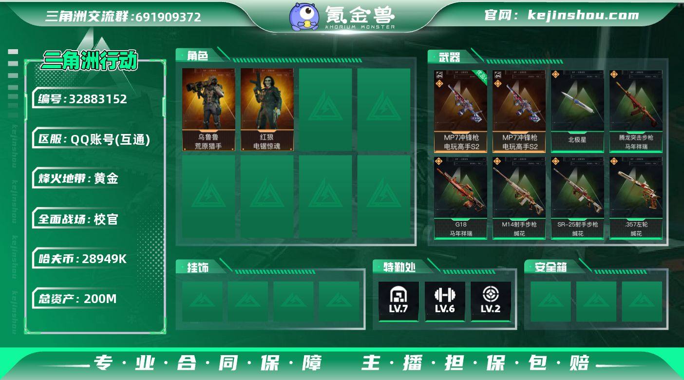 【北极星热门号-MP7冲锋枪-电玩高手S2(优品C)】【Q区三端互通】【无二次协助处理】YXz9754-特勤处:仓库7级/靶场2级/训练中心6级 总资产200m-哈夫币2894w-60烽火等级-黄金-50战场等级-校官 【干员外观】:红狼-电锯惊魂,乌鲁鲁-荒原猎手,蛊-不羁人生 【近战皮肤】:近战-北极星,近战-黑鹰 【典藏外观】:MP7冲锋枪-电玩高手S2 【典藏外观成色】:MP7冲锋枪-电玩高手S2(优品C) 【传说外观】:M4A1突击步枪-蚀金玫瑰,M4A1突击步枪-阿米娅,ASh-12战斗步枪-鹅鸭杀,M16A4突击步枪-狩猎时刻,SG552突击步枪-点翠,SCAR-H战斗步枪-水墨云图,SCAR-H战斗步枪-启航,G3战斗步枪-狩猎时刻,G3战斗步枪-骑士,CAR-15突击步枪-阿米娅,腾龙突击步枪-捞点薯条,腾龙突击步枪-马年祥瑞,KC17突击步枪-电锯惊魂,KC17突击步枪-点翠,Vector冲锋枪-狩猎时刻,勇士冲锋枪-能天使-午夜邮差,QCQ171冲锋枪-鹅鸭杀,QJB201轻机枪-鹅鸭杀,M14射手步枪-蛮荒,M14射手步枪-缄花,SR-25射手步枪-缄花,PSG-1射手步枪-点翠,AWM狙击步枪-捞点薯条,.357左轮-缄花,G18-马年祥瑞,93R-捞点薯条,复合弓-黑·天际线 【史诗外观】:AKM突击步枪-林中猎手,K416突击步枪-冬日风情,K416突击步枪-腊梅...