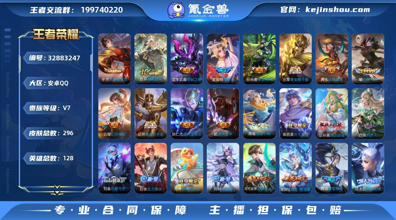 王者20252 无二次 钱包未注销 安卓Q-V7-至尊星耀II段位-128英雄-296皮肤-1典藏皮肤-11传说-85史诗 【英雄全皮】:敖隐全皮,夏洛特全皮 【荣耀典藏】:芈月大秦宣太后 【传说皮肤】:后羿神树通天,云缨幻光神枪,典韦战鼓燎原,夏洛特浮生妄,铠绛天战甲,曜云鹰飞将,达摩黄金狮子座,后羿黄金射手座,孙尚香末日机甲,宫本武藏地狱之眼,狄仁杰超时空战士 【限定皮肤】:白起狰,大乔绒语心约,狄仁杰阴阳师,赵云皇家上将,墨子神迹守卫,墨子降魔,高渐离玩趣恶龙,扁鹊奇幻香踪,芈月重明,芈月幻夜卜梦,周瑜赤莲之焰,元歌无心,夏侯惇朔风刀,曹操烛龙,典韦穷奇,马可波罗山海玄木吟,狄仁杰魔术师,狄仁杰万华元夜,达摩沙漠行僧,项羽海滩派对,老夫子醍醐杖,老夫子航海奇遇记,程咬金演武夺筹,韩信傲雪梅枪,兰陵王驯魔猎人,兰陵王金庭之子,花木兰默契交锋,牛魔御旌,后羿圣弓游侠,刘备百相守梦,李元芳云中旅人,钟馗驱傩正仪,杨戬潮玩骑兵,女娲朔望之晖,干将莫邪真爱魔法,雅典娜单词大作战,蔡文姬繁星吟游,太乙真人饕餮,鬼谷子原初探秘者,黄忠火炮绅士,苏烈千军破阵,弈星混沌棋,沈梦溪大漠名商,沈梦溪匿光破解者,明世隐疑决卦,裴擒虎李小...