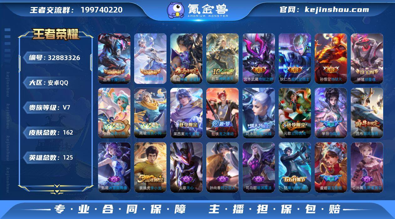 无二次-安卓Q-V7-至尊星耀II段位-125英雄-162皮肤-2典藏皮肤-5传说-48史诗 【荣耀典藏】:伽罗最初的交响,吕布千魇归渊 【传说皮肤】:马超神骥逐星野,后羿神树通天,宫本武藏地狱之眼,孙悟空地狱火,狄仁杰超时空战士 【限定皮肤】:姜子牙天穹之誓,狄仁杰阴阳师,赵云皇家上将,墨子神迹守卫,芈月白晶晶,吕布御风骁将,元歌云间偶戏,元歌无心,夏侯惇朔风刀,曹操烛龙,狄仁杰魔术师,狄仁杰万华元夜,达摩沙漠行僧,项羽海滩派对,老夫子醍醐杖,老夫子航海奇遇记,程咬金演武夺筹,韩信逐梦之影,花木兰默契交锋,亚瑟潮玩骑士王,牛魔奔雷神使,张飞虎魄,李元芳云中旅人,虞姬霸王别姬,钟馗驱傩正仪,杨玉环遇见飞天,鬼谷子原初探秘者,苏烈千军破阵,弈星混沌棋,沈梦溪大漠名商,明世隐疑决卦,裴擒虎李小龙,裴擒虎擒涛扼浪,米莱狄御霄,盾山御銮,猪八戒西部大镖客,上官婉儿梁祝,鲁班大师探海日志,艾琳女武神,鬼谷子天穹祈灯,鲁班七号蔬乡物语,李元芳蔬乡物语,刘邦剑破天穹,周瑜熔金海岸 【年限皮肤】:吕布御风骁将,牛魔奔雷神使 【赛季限定】:曹操烛龙,米莱狄御霄,盾山御銮,夏侯惇朔风刀,弈星混沌棋,明世隐疑决卦,老夫子醍醐杖,鬼谷子...