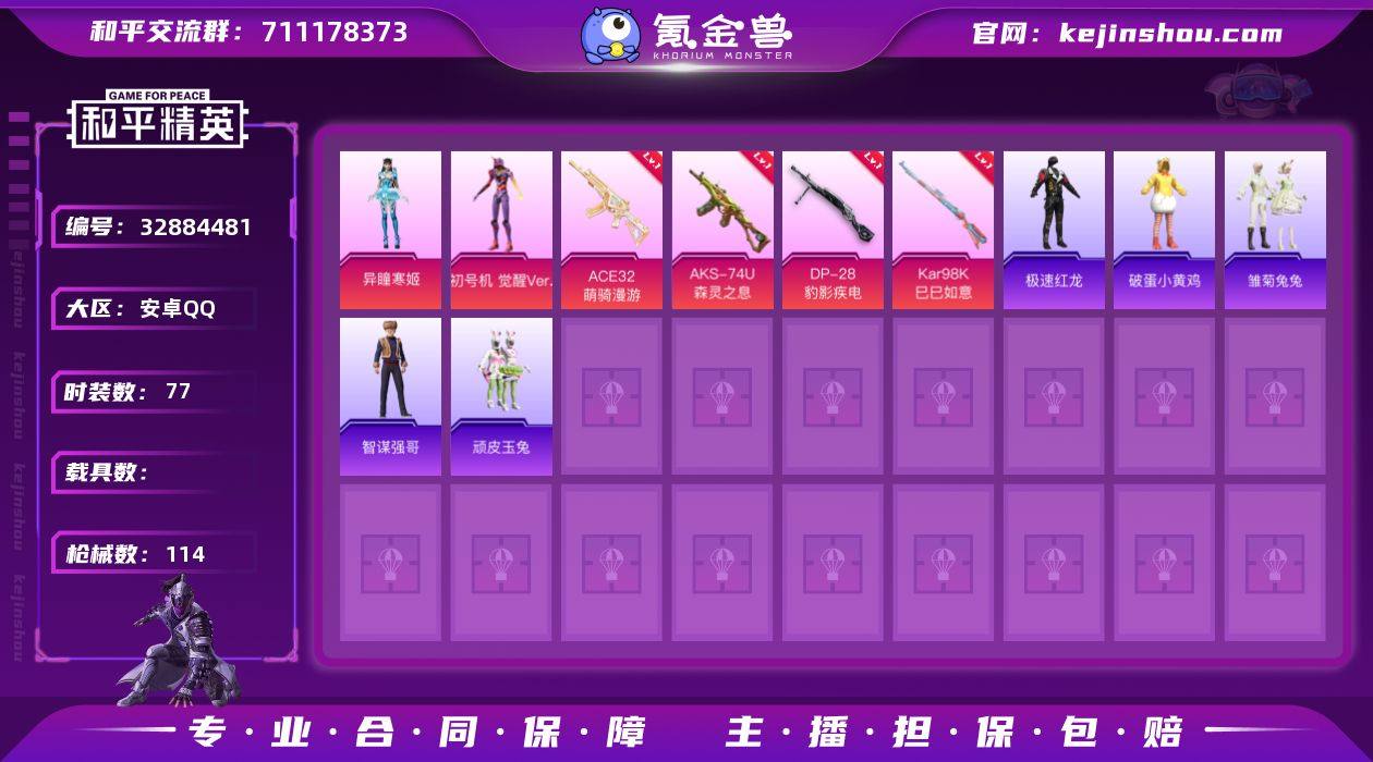DYH18120【三色螳螂2粉5特 紫螳螂 蓝螳螂 8号机】安卓手Q-2粉装-5特效枪-77套装-114枪皮-0王牌印记-坚韧铂金Ⅳ-29535热力值【2粉装】角色-初号机 觉醒Ver.,角色-异瞳寒姬【5特效枪】DP-28-豹影疾电[5级],Mk14-福马献瑞[5级],ACE32-萌骑漫游[4级],Kar98K-巳巳如意[5级],AKS-74U-森灵之息[5级]【6飞行器】马上有福飞行器,炫彩糖果飞行器,登顶巅峰飞行器,顶峰精英尾迹,狂鲨锋刃飞行器,鸡智如我飞行器【184其它衣服和枪皮】迅捷龙虾,SS36特训,绮丽涂鸦,顽皮玉兔,黑色伏地魔,漫游都市,街头风暴,SS29特训,SS33特训,冰河战士,王牌教练,SS37特训,长空猛禽,雪国风尚,疯狂小兔子,魅力单车,破晓战魂,鹤鸣,红釉青花,元素星魂,战术大师,SS35特训,极速红龙,云魄琉璃,福马献瑞,阳光火鸡,玲珑侠影,热情海星,破蛋小黄鸡,青翼流星,雏菊兔兔,SS34特训,狂鲨锋刃,角色-8号机,星途旅人,黄色伏地魔,SS28特训,角色-甜心蒙太奇,马上来财,萝兰蝴蝶,街头潮人,角色-紫俏灵猫,狙击之神,角色-Mark.06,星梦畅游,纯真浪花,蝶变,SS32特训,福星高照,角色-米开朗基罗,SS31特训,星渊小夜曲,森林游猎者,大橘大利,龙魂突击队,香桃花海,萌鸡速递,耀粉歌者,炫彩糖果,SS25特训,缤纷果语,绯格组合,智谋强哥,空岛之星,冷焰...