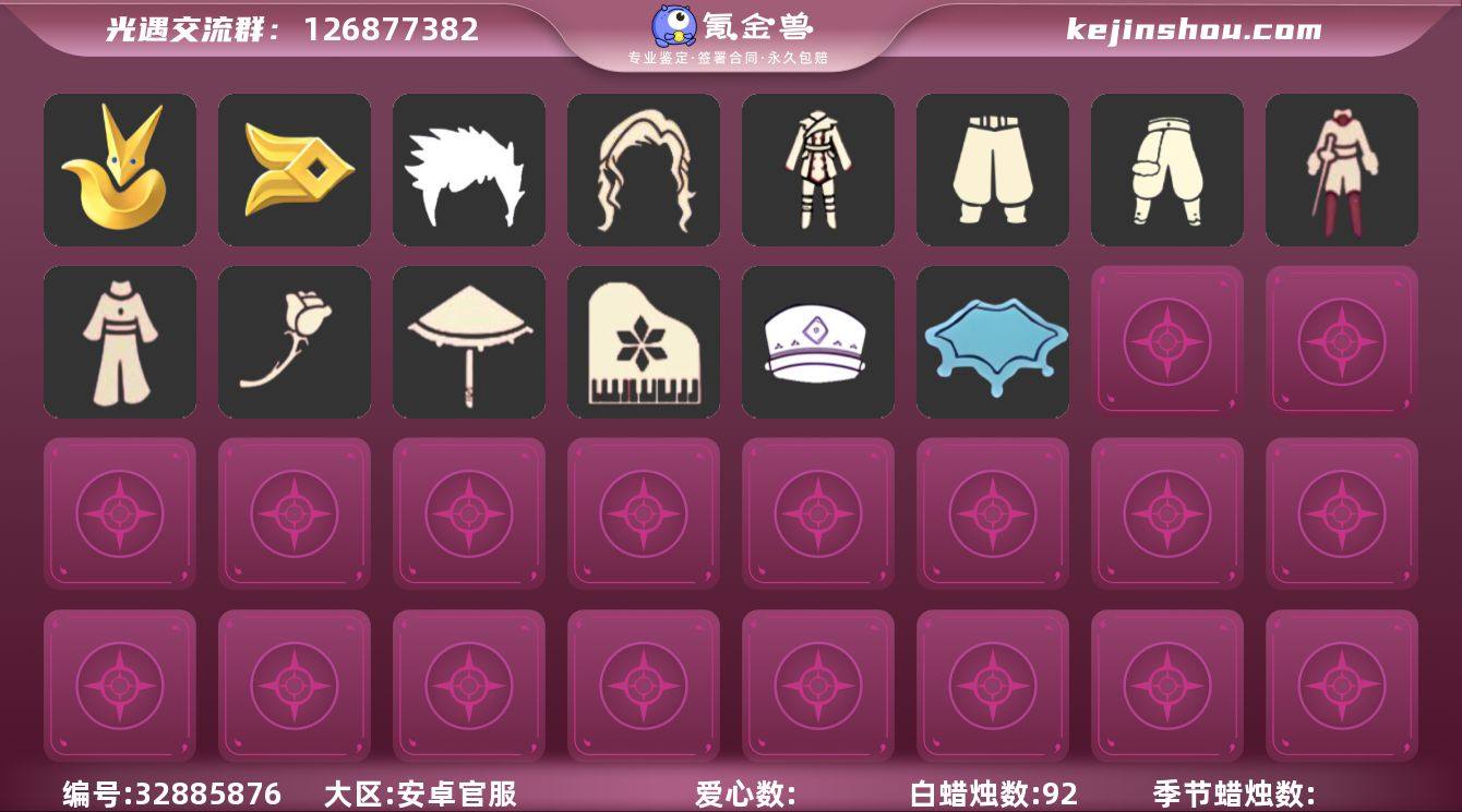 安卓官服 手机账号 1珍稀物品 2毕业季 3毕业图 92蜡烛 【珍稀物品】玫瑰花【季节已毕业】小王子季(王子季),风行季【完成地图】晨岛,雨林,霞谷【礼包】运动鞋(跃动跑鞋),水母(水母肩饰),南瓜(冥龙南瓜),巫师(巫师帽),绊爱(绊爱斗篷)(绊爱礼包),兔子(玉兔头饰)(玉兔发饰)(兔子发饰),鹿角(圣诞鹿角),创始人(创始人斗篷),星球斗(星球夹克),福娃(福娃礼包)(春之日礼包)(铜钱斗),蜘蛛斗(蛛丝斗篷)(蛛网斗篷),瑞雪(瑞雪斗篷)(暖冬瑞雪),白绒金(白雪斗篷),灯笼(中秋灯笼),献瑞折扇礼包,小狐狸(狐狸背包)【裤子】风行毕业裤子(羽袖长袍),王子服(小王子套装),武士裤,搓澡巾,击剑裤【面具】黄眉企鹅面具【发型】小王子发型,虚荣【头饰】平顶帽,羽毛发饰(多羽发饰)【斗篷】瑞雪斗篷【配饰】玫瑰花,雨伞,高音钢琴(白色高脚钢琴)