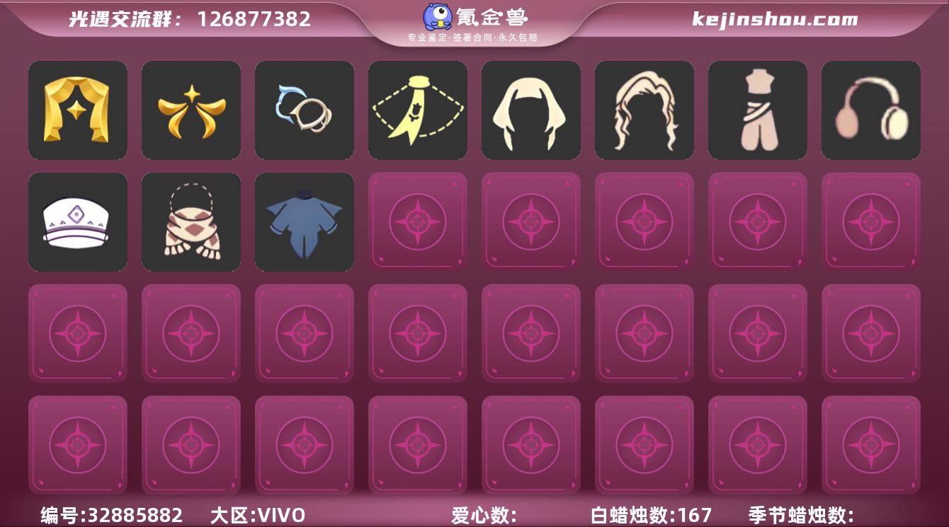 VIVO 手机账号 2珍稀物品 3毕业季 2毕业图 167蜡烛 【珍稀物品】白枭(帝企鹅发),透明蝶翼斗【季节已毕业】表演季,欧若拉季(欧若拉),双星季【完成地图】晨岛,霞谷【礼包】兔子鞋(兔子拖鞋),新年裤(瑞气服饰),暗彩装扮(彩虹武士裤),巫师(巫师帽),橘子(大橘大利),小狗周年发饰(小狗周年头饰),兔子(玉兔头饰)(玉兔发饰)(兔子发饰),彩虹耳钉(彩虹耳饰),彩虹耳机,满月耳坠,枯角(巫树犄角),鹿角(圣诞鹿角),创始人(创始人斗篷),福娃(福娃礼包)(春之日礼包)(铜钱斗),蝙蝠套(蝙蝠斗篷)(南瓜头),白绒金(白雪斗篷),青衫落拓礼包,红伞(瑞气纸伞),黄伞(夏日阳伞),餐桌(野餐礼包),猫背饰(猫咪背饰)【裤子】蓝绿裤(高领舞服)【面具】黄眉企鹅面具【面饰】红耳机【项链】围巾(肩带)【发型】留辫蘑菇头,虚荣【头饰】平顶帽【斗篷】燕尾斗篷