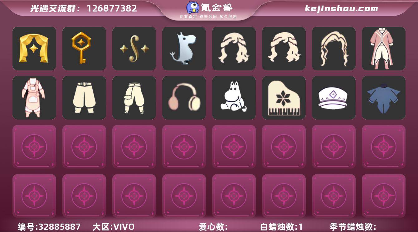 VIVO 手机账号 1珍稀物品 4毕业季 3毕业图 1蜡烛 【珍稀物品】白枭(帝企鹅发)【季节已毕业】表演季,筑巢季,二重奏季,姆明季【完成地图】晨岛,霞谷,墓土(暮土)【礼包】海蓝波浪发型(海洋发型),巫师(巫师帽),大耳狗装扮,橘子(大橘大利),贝壳(贝壳发饰),兔子(玉兔头饰)(玉兔发饰)(兔子发饰),九色鹿角(神鹿祝福头饰)(神鹿祝福礼包),日光耳环,鹿角(圣诞鹿角),创始人(创始人斗篷),莲花斗(异彩莲花斗篷),福娃(福娃礼包)(春之日礼包)(铜钱斗),线框斗篷礼包(周年线框斗篷),蝙蝠套(蝙蝠斗篷)(南瓜头),白绒金(白雪斗篷),竖琴(雏鸟之琴),吉他(音韵吉他)(白吉他),手碟(凯旋手碟),电吉他(周年电吉他),小提琴(凯旋提琴),飞鸟纸伞,茶壶(小憩茶桌),小船(情人小船),南瓜(冥龙南瓜)【裤子】筑巢季·裤子(设计师长袍),青鸟尊贵蓬头裤子(蓝色燕尾服),妮妮裙子(妮妮长裙),武士裤,搓澡巾【面具】黄眉企鹅面具【面饰】红耳机【发型】海蓝波浪发型,虚荣【头饰】平顶帽,蓝色音乐会(蓝色音乐符)【斗篷】燕尾斗篷,海洋斗【配饰】小红伞(姆明红伞)(姆明大伞),姆明抱枕,二重奏挂画(合奏挂画),筑巢季·小手办(光之子试衣),高音钢琴(白色高脚钢琴)