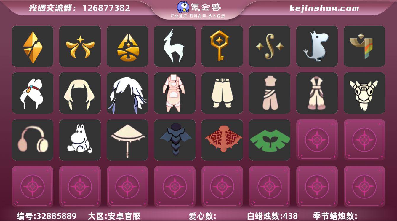 安卓官服 手机账号 2珍稀物品 8毕业季 1毕业图 438蜡烛 【珍稀物品】:透明蝶翼斗,彩虹围巾(五塑彩带斗)【季节已毕业】:破晓季,欧若拉季(欧若拉),归巢季,九色鹿(九色鹿季),筑巢季,二重奏季,姆明季,彩染季【完成地图】:雨林【礼包】:运动鞋(跃动跑鞋),姆明饰品套装(姆明尾巴),南瓜(冥龙南瓜),巫师(巫师帽),雪花(雪花发夹),四叶草(四叶草头饰),彩虹耳机,创始人(创始人斗篷),蜘蛛斗(蛛丝斗篷)(蛛网斗篷),猫套(皮皮猫斗)(皮皮猫礼包)【裤子】:飞天裤(柔缎花边连)(九色鹿丝带裤),筑巢季·裤子(设计师长袍),妮妮裙子(妮妮长裙),蓝绿裤(高领舞服),武士裤【面具】:辉光羚羊面具【面饰】:红耳机【发型】:飞天盘发(九色鹿丸子头),留辫蘑菇头,归巢毕业发型(五塑彩羽发),若笠(箬笠)【头饰】:蓝色音乐会(蓝色音乐符)【斗篷】:遥鲲斗篷(双翼遥鲲斗),冥龙斗篷,彩染围巾斗篷,绿芽,海洋斗【配饰】:小红伞(姆明红伞)(姆明大伞),姆明抱枕,雨伞,筑巢季·小手办(光之子试衣)
