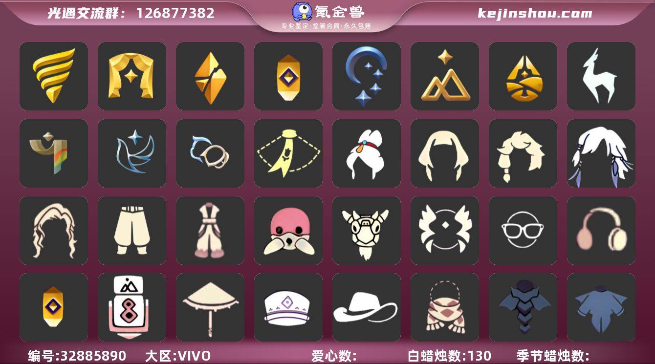 VIVO 手机账号 2珍稀物品 11毕业季 6毕业图 130蜡烛 【珍稀物品】:白枭(帝企鹅发),彩虹围巾(五塑彩带斗)【季节已毕业】:双星季,青鸟季,潜海季,表演季,破晓季,追忆季,夜行季,拾光季,归巢季,九色鹿(九色鹿季),彩染季【完成地图】:晨岛,云野,雨林,霞谷,墓土(暮土),禁阁【礼包】:青衫落拓礼包,周年影院套餐礼包,运动鞋(跃动跑鞋),暗彩装扮(彩虹武士裤),蝴蝶结(大蝴蝶结),姆明饰品套装(姆明尾巴),彩虹帽(多彩绒帽),南瓜(冥龙南瓜),巫师(巫师帽),绊爱(绊爱斗篷)(绊爱礼包),橘子(大橘大利),奥利奥(周年庆抱枕),雪花(雪花发夹),贝壳(贝壳发饰),兔子(玉兔头饰)(玉兔发饰)(兔子发饰),四叶草(四叶草头饰),新年耳钉(金鳞耳饰),彩虹耳机,鹿角(圣诞鹿角),创始人(创始人斗篷),围巾(小王子斗篷)(小王子围巾),欧若拉之翼,蝙蝠套(蝙蝠斗篷)(南瓜头),吉他(音韵吉他)(白吉他),黄伞(夏日阳伞),献瑞折扇礼包,秋千(情人秋千),茶桌(花憩茶桌),小狐狸(狐狸背包),大铁头,小狗周年发饰(小狗周年头饰)【裤子】:飞天裤(柔缎花边连)(九色鹿丝带裤),武士裤【面具】:夜行毕业面具(棕熊面具),呼吸面具(潜水面具),黄眉企鹅面具,辉光羚羊面具【面饰】:黑框眼镜(粗框眼镜),青鸟毕业面饰(青鸟面饰),红耳机【项链】:...