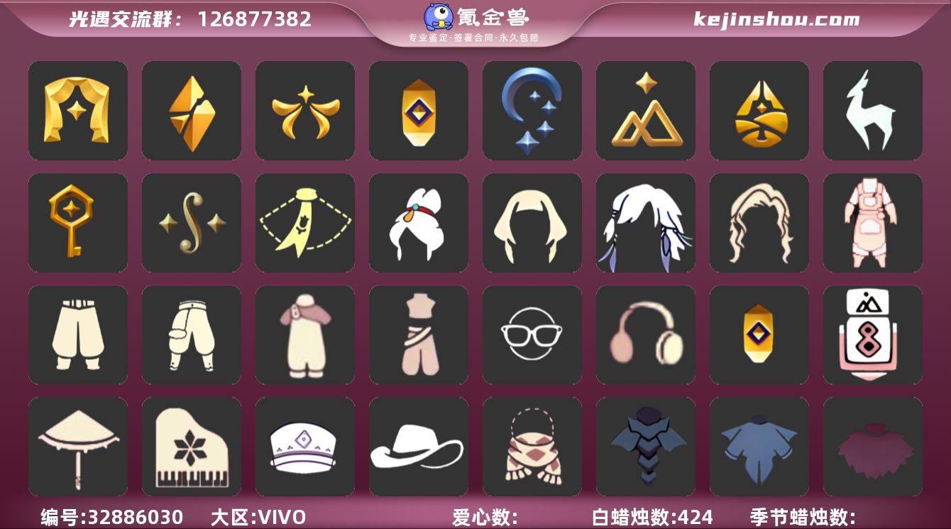 VIVO 手机账号 3珍稀物品 10毕业季 4毕业图 424蜡烛 【珍稀物品】白枭(帝企鹅发),透明蝶翼斗,彩虹围巾(五塑彩带斗)【季节已毕业】表演季,破晓季,欧若拉季(欧若拉),追忆季,夜行季,拾光季,归巢季,九色鹿(九色鹿季),筑巢季,二重奏季【完成地图】晨岛,雨林,霞谷,墓土(暮土)【礼包】运动鞋(跃动跑鞋),巫师(巫师帽),橘子(大橘大利),兔子(玉兔头饰)(玉兔发饰)(兔子发饰),四叶草(四叶草头饰),彩虹耳机,创始人(创始人斗篷),白绒金(白雪斗篷),吉他(音韵吉他)(白吉他),红伞(瑞气纸伞),秋千(情人秋千),茶桌(花憩茶桌),茶壶(小憩茶桌),猫背饰(猫咪背饰)【裤子】筑巢季·裤子(设计师长袍),蓝绿裤(高领舞服),武士裤,背带裤,搓澡巾【面具】黄眉企鹅面具,夜行毕业面具(棕熊面具)【面饰】黑框眼镜(粗框眼镜),红耳机【项链】围巾(肩带)【发型】留辫蘑菇头,飞天盘发(九色鹿丸子头),虚荣,归巢毕业发型(五塑彩羽发),若笠(箬笠)【头饰】平顶帽,蓝色音乐会(蓝色音乐符),牛仔帽(西部帽)【斗篷】冥龙斗篷,燕尾斗篷,遥鲲斗篷(双翼遥鲲斗),粉红绒毛斗篷(绒毛斗篷),彩染围巾斗篷,绿芽,海洋斗【配饰】鲲灯(追忆之书),相机(季卡相机),雨伞,筑巢季·小手办(光之子试衣),高音钢琴(白色高脚钢琴)