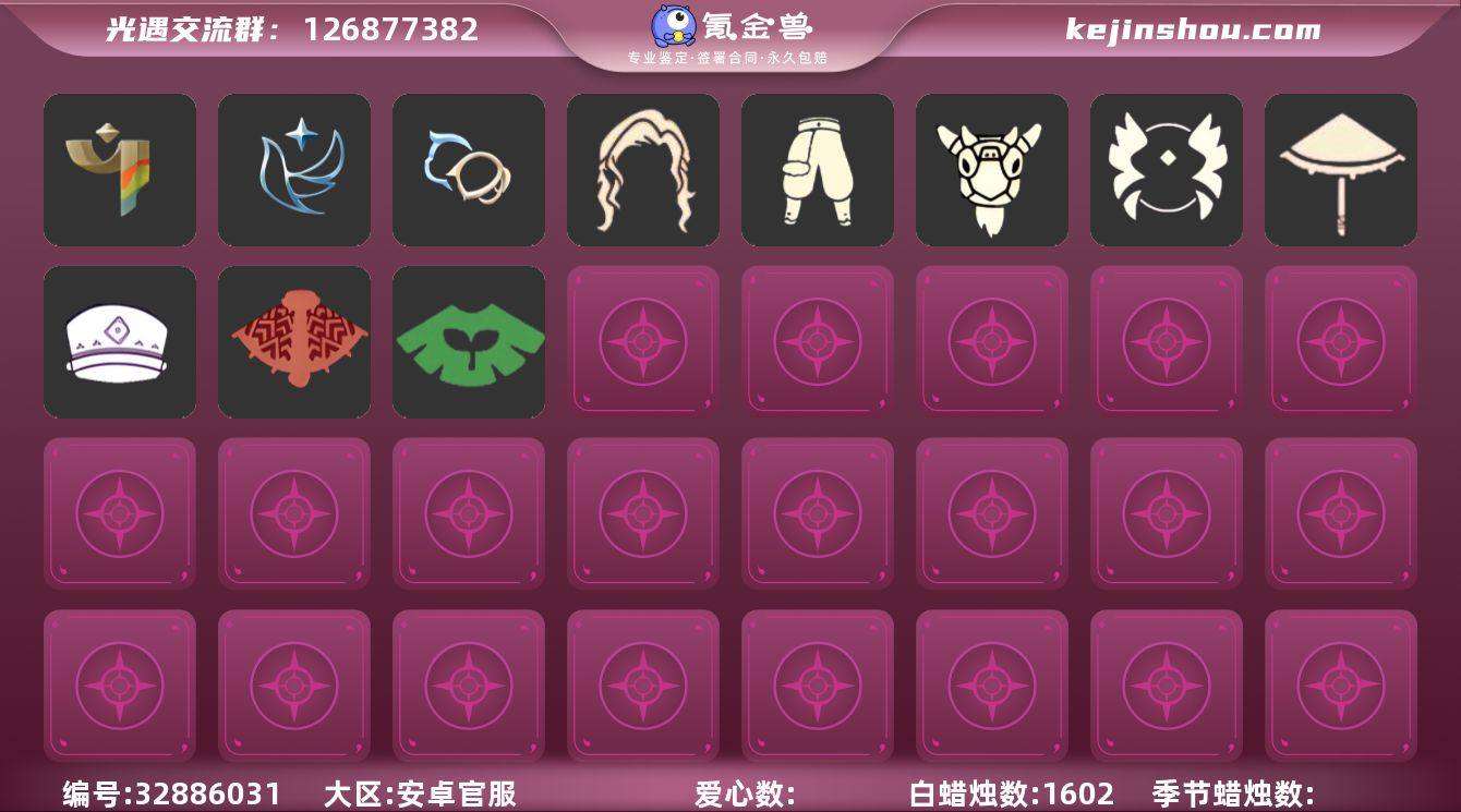 安卓官服 手机账号 4毕业季 2毕业图 1602蜡烛 【季节已毕业】彩染季,青鸟季,双星季,迁徙季【完成地图】雨林,霞谷【礼包】宝藏猎人礼包,牛仔裤(阔腿牛仔),优雅三件套(西装套装),兔子鞋(兔子拖鞋),运动鞋(跃动跑鞋),新年裤(瑞气服饰),龙鳞束身长袍,暗彩装扮(彩虹武士裤),向日葵连衣裙(连衣裙),爱心眼镜,周年影院套餐礼包,蝴蝶结(大蝴蝶结),姆明饰品套装(姆明尾巴),活力海牛礼包,向日葵套(夏日有友礼包),巫师(巫师帽),橘子(大橘大利),小狗周年发饰(小狗周年头饰),兔子(玉兔头饰)(玉兔发饰)(兔子发饰),心心相印发饰礼包,四叶草(四叶草头饰),星月头饰(星月头冠),彩虹耳机,日光耳环,围巾(小王子斗篷)(小王子围巾),星球斗(星球夹克),欧若拉之翼,福娃(福娃礼包)(春之日礼包)(铜钱斗),衔福献瑞礼包(衔福献瑞斗篷),蝙蝠套(蝙蝠斗篷)(南瓜头),猫套(皮皮猫斗)(皮皮猫礼包),透明蛛丝(透明蜘蛛斗),瑞雪(瑞雪斗篷)(暖冬瑞雪),风之旅人(风之旅人礼包),青衫落拓礼包,吉他(音韵吉他)(白吉他),小提琴(凯旋提琴),红伞(瑞气纸伞),献瑞折扇礼包,魔法棒(惊喜手杖)(仙女棒),茶桌(花憩茶桌)【裤子】搓澡巾【面具】辉光羚羊面具【面饰】青鸟毕业面饰(青鸟面饰)【发型】虚荣,若笠(箬笠)【头饰】平顶帽【斗...