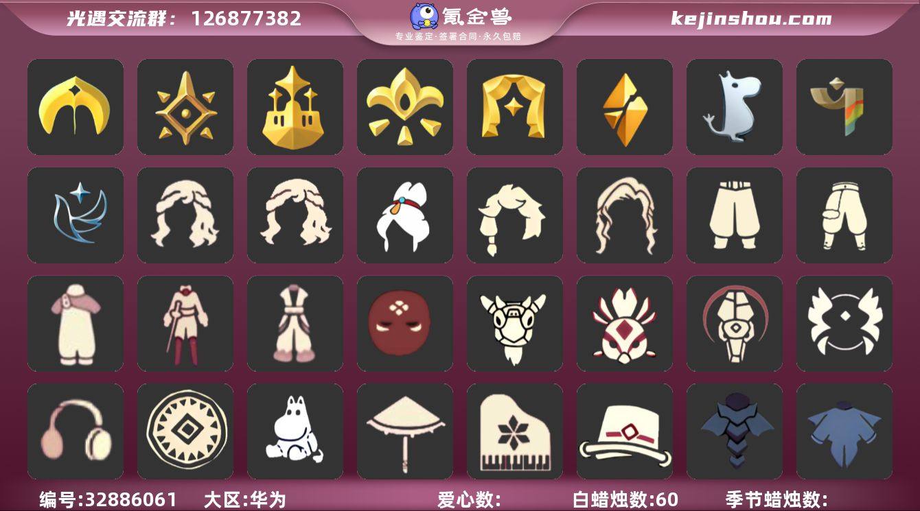 [16742024]华为 手机账号 3珍稀物品 9毕业季 6毕业图 60蜡烛 【珍稀物品】:白枭(帝企鹅发),阿努比斯(狗头),鳐鲲斗篷【季节已毕业】:青鸟季,圣岛季,预言季,梦想季,集结季,表演季,破晓季,姆明季,彩染季【完成地图】:晨岛,云野,雨林,霞谷,墓土(暮土),禁阁【礼包】:宝藏猎人礼包,牛仔裤(阔腿牛仔),运动鞋(跃动跑鞋),姆明饰品套装(姆明尾巴),绒帽(温暖绒帽),海蓝波浪发型(海洋发型),巫师(巫师帽),橘子(大橘大利),兔子(玉兔头饰)(玉兔发饰)(兔子发饰),九色鹿角(神鹿祝福头饰)(神鹿祝福礼包),新年耳钉(金鳞耳饰),满月耳坠,鹿角(圣诞鹿角),创始人(创始人斗篷),欧若拉之翼,遥鲲披肩斗篷(披肩外袍),蝙蝠套(蝙蝠斗篷)(南瓜头),秋千(情人秋千)【裤子】:飞天裤(柔缎花边连)(九色鹿丝带裤),妮妮裙子(妮妮长裙),武士裤,背带裤,搓澡巾,击剑裤【面具】:贴花面具(丛林黑面具),黄眉企鹅面具,辉光羚羊面具,凤凰面具,阿努比斯【面饰】:青鸟毕业面饰(青鸟面饰),红耳机【发型】:单侧绑发(单边小辫),海蓝波浪发型,飞天盘发(九色鹿丸子头),虚荣,若笠(箬笠)【头饰】:行军锅头盔(六边锅帽子)(双耳锅帽子)【斗篷】:燕尾斗篷,黄色连帽披风(连帽斗篷)(斜边队长斗篷),遥鲲斗篷(双翼遥鲲斗),冥龙斗篷,青鸟毕业...
