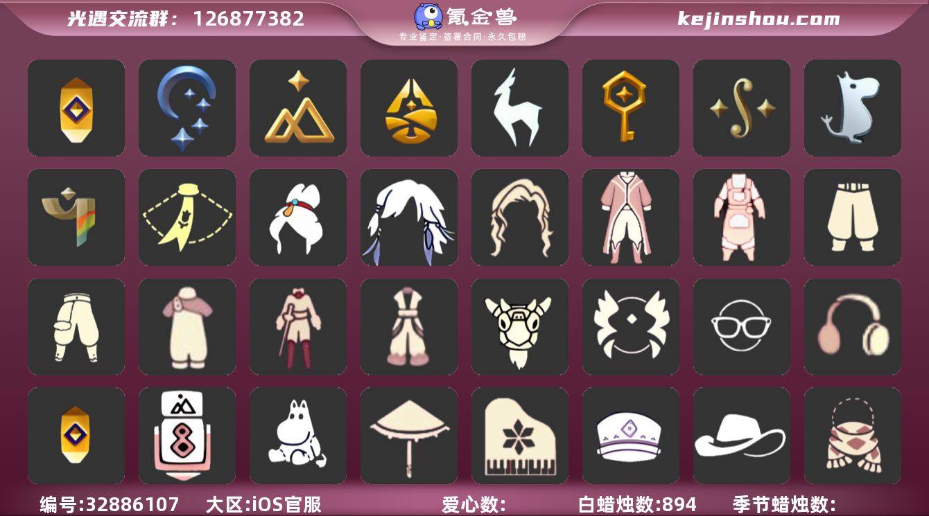 iOS官服 手机账号 1珍稀物品 9毕业季 5毕业图 894蜡烛 【珍稀物品】彩虹围巾(五塑彩带斗)【季节已毕业】追忆季,夜行季,拾光季,归巢季,九色鹿(九色鹿季),筑巢季,二重奏季,姆明季,彩染季【完成地图】晨岛,云野,霞谷,墓土(暮土),禁阁【礼包】青衫落拓礼包,致爱装扮(致爱打扮),向日葵连衣裙(连衣裙),新年裤(瑞气服饰),伯爵面具(吸蟹伯爵)(吸蟹面具),蝴蝶结(大蝴蝶结),南瓜(冥龙南瓜),巫师(巫师帽),绊爱(绊爱斗篷)(绊爱礼包),橘子(大橘大利),雪花(雪花发夹),贝壳(贝壳发饰),兔子(玉兔头饰)(玉兔发饰)(兔子发饰),四叶草(四叶草头饰),彩虹耳钉(彩虹耳饰),彩虹耳机,日光耳环,满月耳坠,鹿角(圣诞鹿角),创始人(创始人斗篷),欧若拉之翼,福娃(福娃礼包)(春之日礼包)(铜钱斗),蝙蝠套(蝙蝠斗篷)(南瓜头),蜘蛛斗(蛛丝斗篷)(蛛网斗篷),透明蛛丝(透明蜘蛛斗),白绒金(白雪斗篷),风之旅人(风之旅人礼包),吉他(音韵吉他)(白吉他),红伞(瑞气纸伞),黄伞(夏日阳伞),秋千(情人秋千),跷跷板(情人跷跷板),茶桌(花憩茶桌),茶壶(小憩茶桌),餐桌(野餐礼包),小船(情人小船),仙境茶会门扉礼包,大铁头,小狗周年发饰(小狗周年头饰)【裤子】筑巢季·裤子(设计师长袍),青鸟尊贵蓬头裤子(蓝色燕尾服),飞天裤(柔缎花...