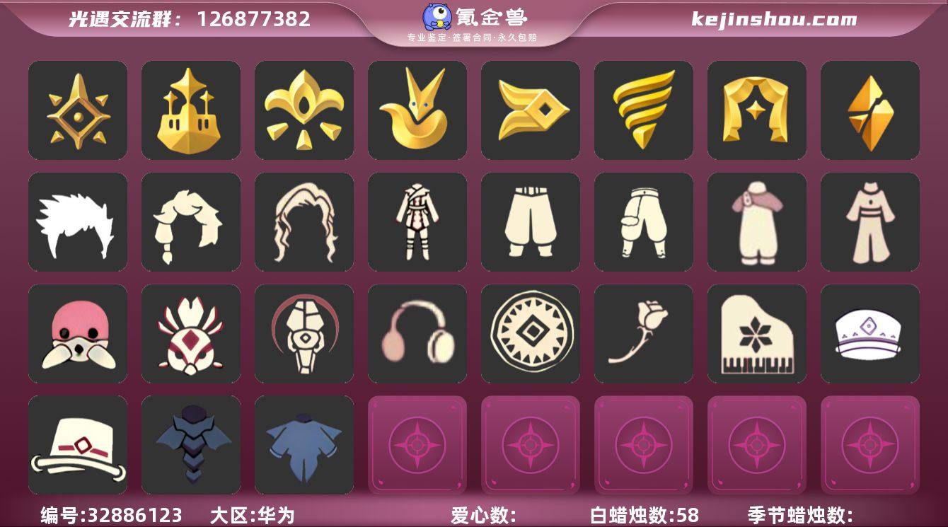 华为 手机账号 3珍稀物品 8毕业季 6毕业图 58蜡烛 【珍稀物品】白枭(帝企鹅发),阿努比斯(狗头),玫瑰花【季节已毕业】预言季,梦想季,集结季,小王子季(王子季),风行季,潜海季,表演季,破晓季【完成地图】晨岛,云野,雨林,霞谷,墓土(暮土),禁阁【礼包】牛仔裤(阔腿牛仔),火焰眼镜,爱心眼镜,绒帽(温暖绒帽),彩虹帽(多彩绒帽),巫师(巫师帽),绊爱(绊爱斗篷)(绊爱礼包),橘子(大橘大利),雪花(雪花发夹),贝壳(贝壳发饰),兔子(玉兔头饰)(玉兔发饰)(兔子发饰),彩虹耳钉(彩虹耳饰),彩虹耳机,枯角(巫树犄角),鹿角(圣诞鹿角),创始人(创始人斗篷),围巾(小王子斗篷)(小王子围巾),星球斗(星球夹克),福娃(福娃礼包)(春之日礼包)(铜钱斗),海龟斗篷,蝙蝠套(蝙蝠斗篷)(南瓜头),猫套(皮皮猫斗)(皮皮猫礼包),伯爵斗篷(吸蟹斗篷),白绒金(白雪斗篷),竖琴(雏鸟之琴),吉他(音韵吉他)(白吉他),灯笼(中秋灯笼),黄伞(夏日阳伞),秋千(情人秋千),跷跷板(情人跷跷板),茶桌(花憩茶桌),茶壶(小憩茶桌),小狐狸(狐狸背包),小船(情人小船),南瓜(冥龙南瓜),猫背饰(猫咪背饰),雪花球(雪花水晶球),滑板(冲浪滑板)(冲浪板)【裤子】风行毕业裤子(羽袖长袍),王子服(小王子套装),武士裤,背带裤,搓澡巾【面具】黄眉企鹅面具,呼...