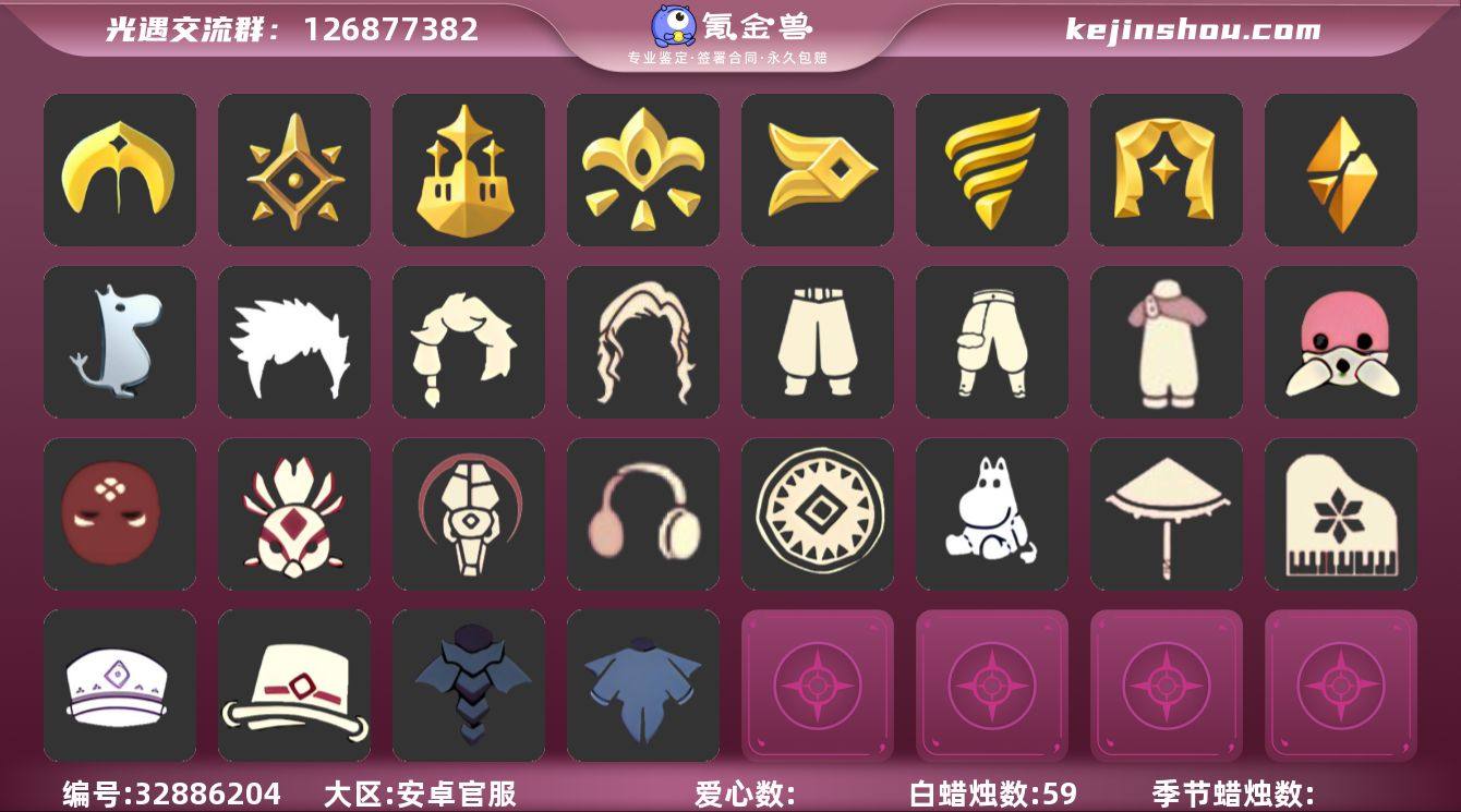 安卓官服 手机账号 3珍稀物品 9毕业季 6毕业图 59蜡烛 【珍稀物品】白枭(帝企鹅发),阿努比斯(狗头),鳐鲲斗篷【季节已毕业】圣岛季,预言季,梦想季,集结季,风行季,潜海季,表演季,破晓季,姆明季【完成地图】晨岛,云野,雨林,霞谷,墓土(暮土),禁阁【礼包】巫师(巫师帽),绊爱(绊爱斗篷)(绊爱礼包),橘子(大橘大利),雪花(雪花发夹),兔子(玉兔头饰)(玉兔发饰)(兔子发饰),鹿角(圣诞鹿角),创始人(创始人斗篷),蝙蝠套(蝙蝠斗篷)(南瓜头),瑞雪(瑞雪斗篷)(暖冬瑞雪),秋千(情人秋千),跷跷板(情人跷跷板),茶桌(花憩茶桌),小船(情人小船)【裤子】妮妮裙子(妮妮长裙),武士裤,背带裤,搓澡巾【面具】呼吸面具(潜水面具),贴花面具(丛林黑面具),黄眉企鹅面具,凤凰面具,阿努比斯【面饰】红耳机【发型】小王子发型,单侧绑发(单边小辫),虚荣,若笠(箬笠)【头饰】平顶帽,蓝色音乐会(蓝色音乐符),行军锅头盔(六边锅帽子)(双耳锅帽子),羽毛发饰(多羽发饰)【斗篷】冥龙斗篷,燕尾斗篷,黄色连帽披风(连帽斗篷)(斜边队长斗篷),遥鲲斗篷(双翼遥鲲斗),蟑螂斗(凤凰斗篷),海洋斗【配饰】蓝色手碟(毕业手碟),圆鼓(手拍大鼓),小红伞(姆明红伞)(姆明大伞),姆明抱枕,雨伞,高音钢琴(白色高脚钢琴)