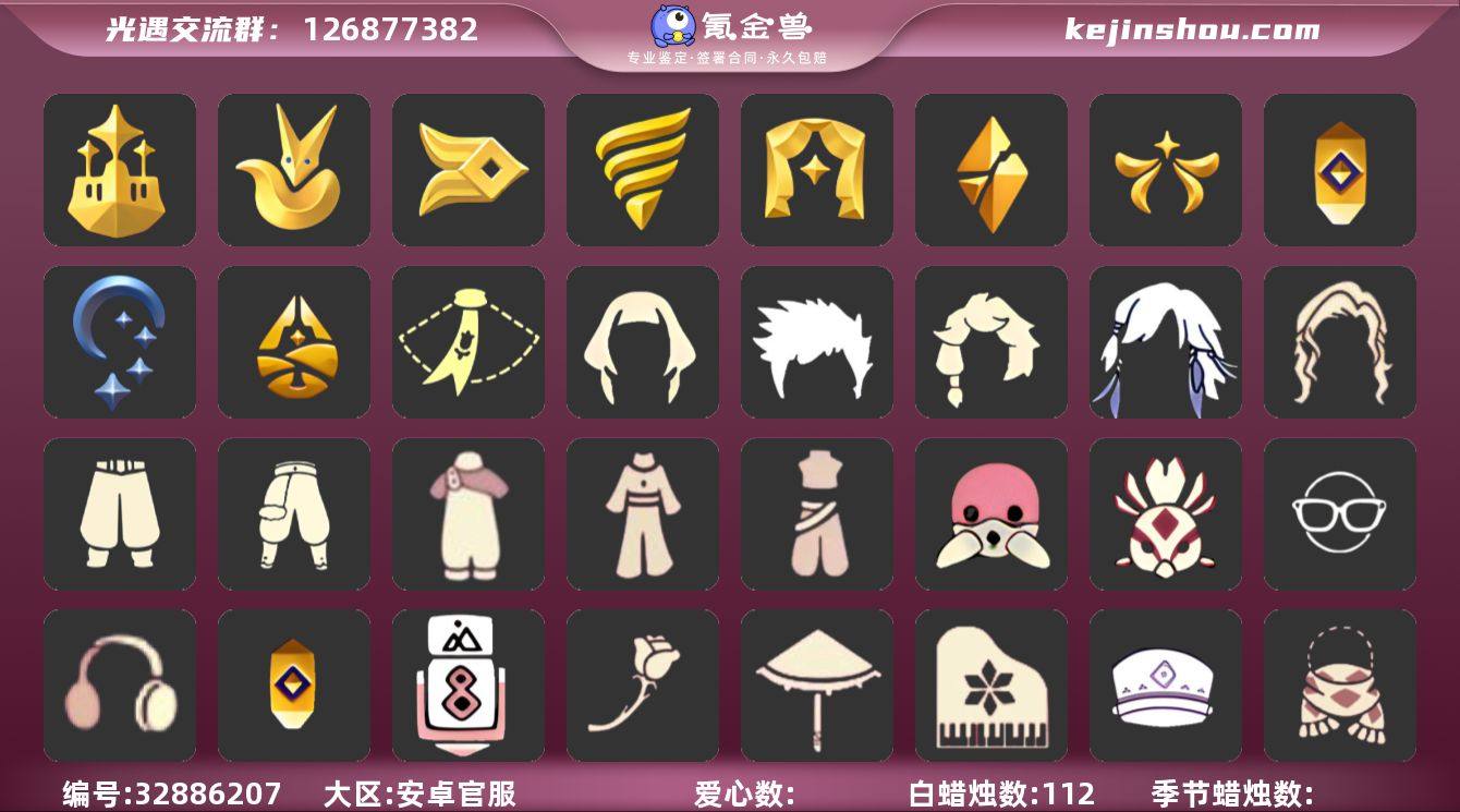 安卓官服 手机账号 4珍稀物品 10毕业季 6毕业图 112蜡烛 【珍稀物品】白枭(帝企鹅发),玫瑰花,透明蝶翼斗,彩虹围巾(五塑彩带斗)【季节已毕业】梦想季,小王子季(王子季),风行季,潜海季,表演季,破晓季,欧若拉季(欧若拉),追忆季,夜行季,归巢季【完成地图】晨岛,云野,雨林,霞谷,墓土(暮土),禁阁【礼包】女巫裙,新年裤(瑞气服饰),奔跑发型(奔离远行发),巫师(巫师帽),绊爱(绊爱斗篷)(绊爱礼包),橘子(大橘大利),雪花(雪花发夹),贝壳(贝壳发饰),兔子(玉兔头饰)(玉兔发饰)(兔子发饰),星月头饰(星月头冠),彩虹耳钉(彩虹耳饰),彩虹耳机,枯角(巫树犄角),鹿角(圣诞鹿角),创始人(创始人斗篷),围巾(小王子斗篷)(小王子围巾),欧若拉之翼,蝙蝠套(蝙蝠斗篷)(南瓜头),蜘蛛斗(蛛丝斗篷)(蛛网斗篷),瑞雪(瑞雪斗篷)(暖冬瑞雪),白绒金(白雪斗篷),人声乐器(欧若拉之声),秋千(情人秋千),茶桌(花憩茶桌),小狐狸(狐狸背包),雪花球(雪花水晶球)【裤子】王子服(小王子套装),蓝绿裤(高领舞服),武士裤,背带裤,搓澡巾【面具】黄眉企鹅面具,夜行毕业面具(棕熊面具),呼吸面具(潜水面具),凤凰面具【面饰】黑框眼镜(粗框眼镜),红耳机【项链】围巾(肩带)【发型】小王子发型,单侧绑发(单边小辫),留辫蘑菇头,虚荣,归巢...