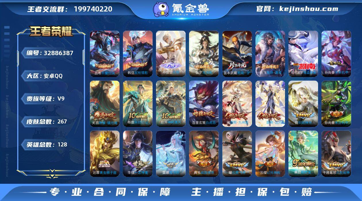 MCK632915 【箭+财双天幕!无相!】 皮肤数量267 印记总数12 【V9】 【绝世王者】 【可修改】 账号类型3 天幕2 无双1 荣耀典藏2 珍品4 星元皮肤1 传说20 史诗84 账号类型:打野号,上单号,射手号; 天幕:天幕-箭叩九天,天幕-财神纳福; 无双:孙悟空_无相; 荣耀典藏:吕布_千魇归渊,韩信_弑枪猎影; 珍品:伽罗_沧流箭,宫本武藏_黑崎一护,张飞_兔狲蓬尾,马可波罗_怪盗基德; 星元皮肤:孙尚香_未来机甲; 传说:达摩_黄金狮子座,百里玄策_白虎志,关羽_神骥·镇沧海,梦奇_胖达荣荣,露娜_霜月吟,孙尚香_末日机甲,曜_云鹰飞将,杨戬-纵目迁山,张良_黄金白羊座,后羿_神树通天,虞姬_启明星使,典韦_战鼓燎原,李信_一念神魔,桑启_鸣野蒿,干将莫邪_久胜战神,云缨_幻光神枪,镜_炽阳神光,澜_愿照九州拓,貂蝉_猫影幻舞,司空震_愿照山河定; 史诗:吕布_末日机甲,项羽_苍穹之光,云中君_时之祈愿,高渐离_天秀音浪,老夫子_航海奇遇记,杨玉环_银翎春语,百里玄策_超元猎域,娜可露露_晚萤,瑶_遇见神鹿,赵云_龙胆,盘古_撼世英歌,小乔_线条小狗,元歌_无心,周瑜_线条小狗,张飞_乱世虎臣,项羽_九幽镇关,妲己_热情桑巴,百里守约_特工魅影,廉颇_地狱岩魂...