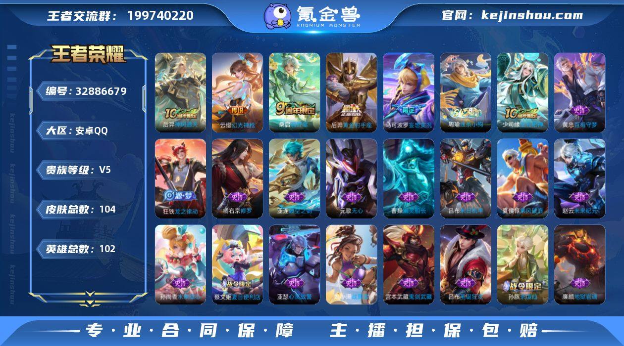 安卓Q-V5-永恒钻石V段位-102英雄-104皮肤-5传说-22史诗 【英雄全皮】:孙权全皮,敖隐全皮 【传说皮肤】:后羿神树通天,云缨幻光神枪,桑启鸣野蒿,马可波罗妄想实况,后羿黄金射手座 【限定皮肤】:蔡文姬夏日便利店,虞姬夏日便利店,姜子牙天穹之誓,杨戬破阵退雄兵,狄仁杰阴阳师,赵云皇家上将,高渐离玩趣恶龙,元歌无心,马可波罗妄想实况,项羽海滩派对,沈梦溪龙舞盛年,刘邦剑破天穹,周瑜熔金海岸 【赛季限定】:刘邦剑破天穹,姜子牙天穹之誓,东皇太一噬灭天穹,钟馗虚灵犬护,甄姬逆浪荇歌 【战令限定】:蔡文姬夏日便利店,虞姬夏日便利店,亚连破空之剑,孙悟空神迹守卫,孙膑茶境仙,马超访茗客,周瑜线条小狗 【史诗皮肤】:周瑜线条小狗,少司缘巫礼祀神,黄忠百相守梦,狂铁龙之律动,孙膑茶境仙,亚连破空之剑,姬小满战舞者,蔡文姬夏日便利店,元歌无心,橘右京修罗,程咬金功夫厨神,李元芳逐浪之夏,刘禅天才门将,亚瑟心灵战警,夏侯惇乘风破浪,吕布末日机甲,曹操幽灵船长,吕布圣诞狂欢,孙尚香水果甜心,宫本武藏鬼剑武藏,廉颇地狱岩魂,赵云未来纪元,赵云皇家上将 【其他皮肤】:吕布舞狮寰,鲁班七号班班快跑,妲己线条小狗,安琪拉糖果风...