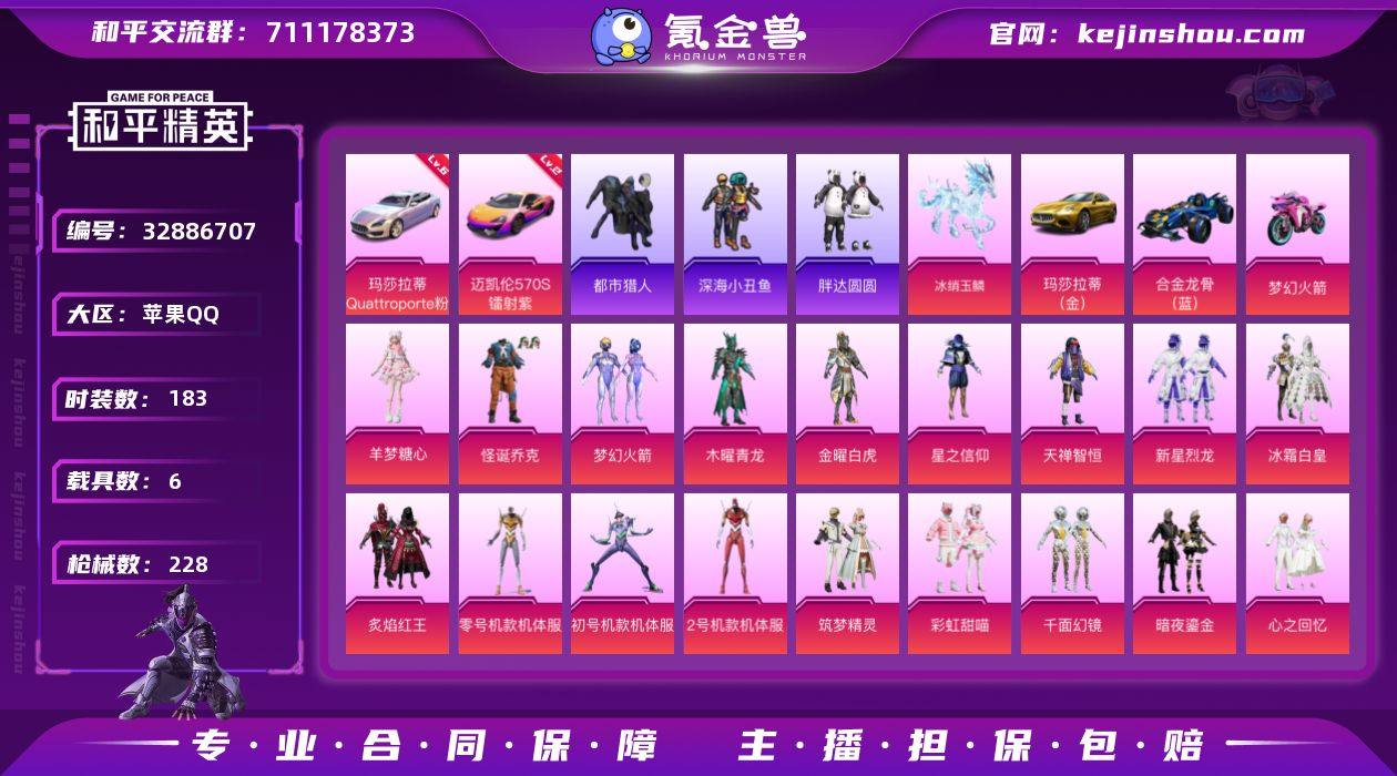 "XY465有二次 苹果Q-2红装8稀有11载具31粉装27特效枪53热门183套装228枪皮 99954热力值 11印记 历史绝世王牌16星 灵猫魔法师-塞维尔 (2级) 最终圣卫者-帕修斯 (2级) 巡查衣都市猎人 浪漫天命 派对舞王 派对舞王(金靴子) M416-心之恋语 (7级) 破片手榴弹-瓶中星球 (6级) 暗影哥特 SS1特训 酷熊伴侣背包 萌熊伴侣背包 【2红装】 灵猫魔法师-塞维尔 (2级) 最终圣卫者-帕修斯 (2级) 【8稀有】 奇异狩猎者 巡查衣 AKM-缤纷海域 AKM-百万伏特 都市猎人 浪漫天命 派对舞王 派对舞王(金靴子) 【11载具】 迈凯伦570S镭射紫 (2级) 玛莎拉蒂Q幻星粉 (6级) 玛莎拉蒂金色 宝马M4(圣保罗黄) 星河领航(磐石银) 冰绡玉鳞 合金龙骨蓝色 黑曜夜骑 星梦玉骢 双人摩托梦幻火箭 辉羽雀灵自行车 【31粉装】 红螳螂 黄螳螂 紫螳螂 圣堂之誓 梦幻火箭 绯穹魔姬 超弦星 荧海星豚 烟云彩露 木曜青龙 金曜白虎 星穹咏叹调 怪诞乔克 羊梦糖心 幻影战神 智耀战神 放客神游 星之信仰 筑梦精灵 第五大道 心之回忆 天禅智恒 新星烈龙 千面幻镜 暗夜鎏金 绚金战神 冰霜白皇 炙焰红王 星之彼岸 彩虹甜喵 桀骜红莲 【27特效枪】 M416-心之恋语 (7级) SCAR-L-魔童闹海哪吒 (3级) P90-冷漠罗丽 (5级) AKM...
