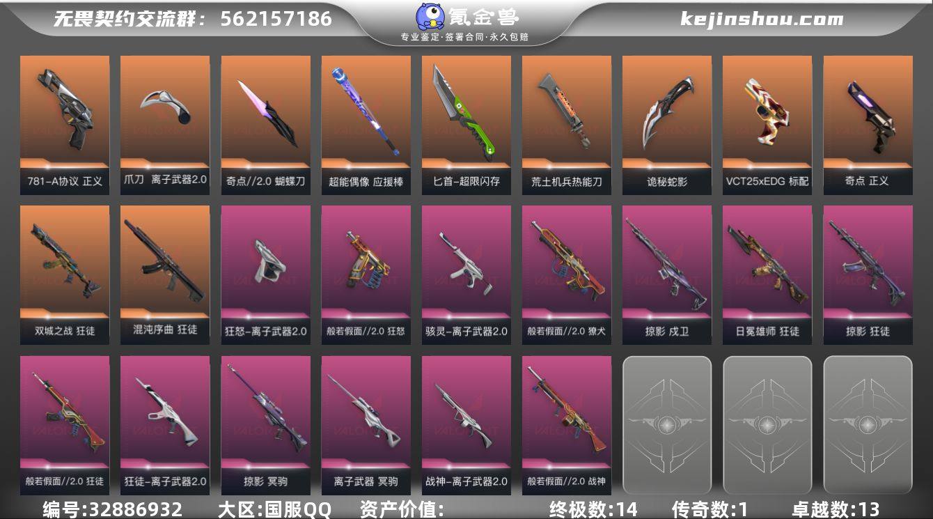 【945151】【套装】:离子武器//2.0套装,般若假面//2.0套装 【英雄】:幻棱,炼狱,维斯,暮蝶,钛狐,壹决,铁臂,捷风,雷兹,幽影,不死鸟,贤者,猎枭,蝰蛇,零,芮娜,奇乐,尚勃勒,霓虹,斯凯,夜露,星礈,K/O,海神,盖可,黑梦,钢锁 【近战武器】:近战武器-奇点//2.0 蝴蝶刀,近战武器-紫金爪刀,近战武器-落英飞旋,近战武器-鬼丸国纲,近战武器-离子武器//2.0 爪刀,近战武器-超能偶像 应援棒,近战武器-超限闪存 匕首,近战武器-盖亚之愠,近战武器-荒土机兵 热能刀,近战武器-诡秘蛇影 军刀 【狂徒】:狂徒-混沌序曲,狂徒-双城之战,狂徒-般若假面//2.0,狂徒-掠影,狂徒-日冕雄师,狂徒-离子武器//2.0,狂徒-超能偶像,狂徒-荒土机兵,狂徒-诡秘蛇影 【幻影】:幻影-超限闪存,幻影-聚合之力,幻影-纳米打击,幻影-末日之翼 【戍卫】:戍卫-掠影,戍卫-超能偶像,戍卫-浮光跃金,戍卫-逆冲蛮牛,戍卫-折光棱晶 【獠犬】:獠犬-般若假面//2.0,獠犬-采蜜小蜂队,獠犬-模拟赫兹,獠犬-逆冲蛮牛 【冥驹】:冥驹-掠影,冥驹-离子武器,冥驹-荒土机兵,冥驹-模拟赫兹 【飞将】:飞将-聚合之力,飞将-末日之翼 【莽侠】:莽侠-超限闪存,莽侠-诡秘蛇影 【战神】...