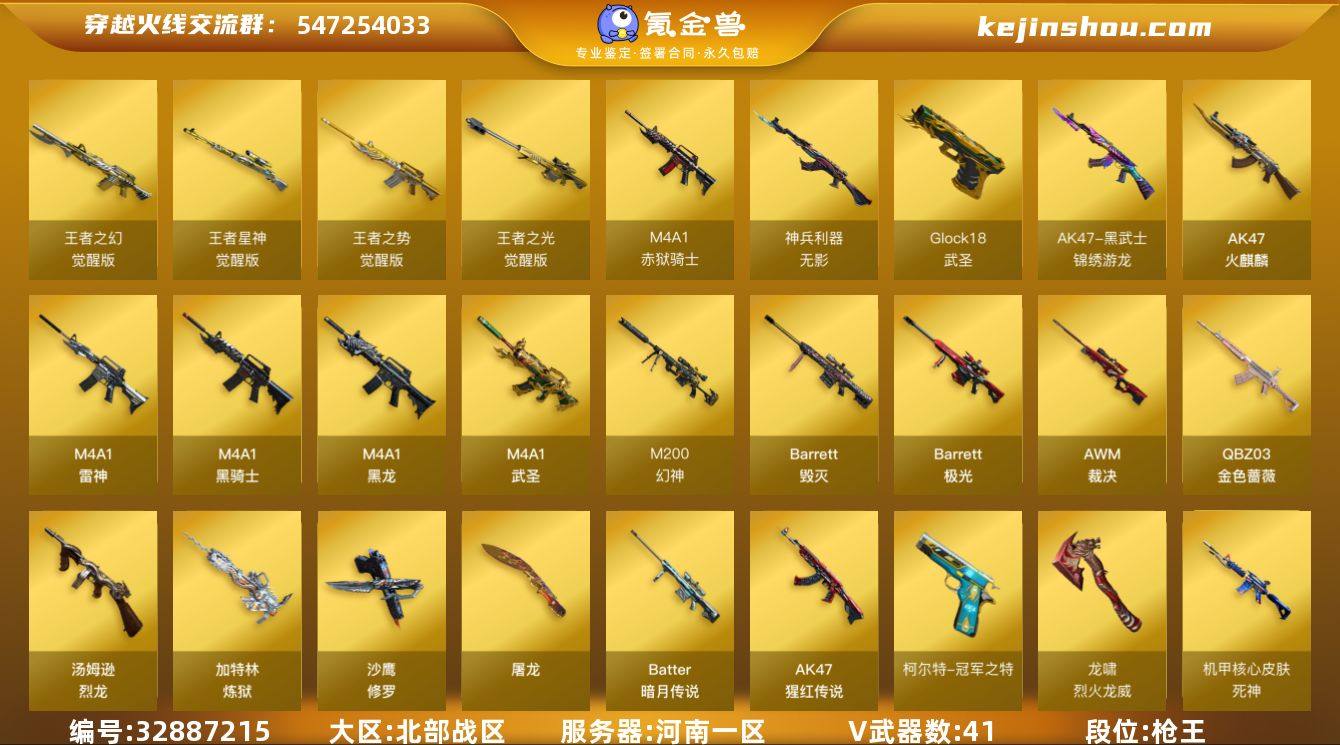 河南一区-50V-4王者武器数-0炫金武器数 【热门武器】:QBZ03-金色蔷薇,M200-幻神,死亡之眼*2,柯尔特-冠军之特,M4A1-黑骑士,汤姆逊-烈龙*6,加特林-炼狱,COP-白鲨,沙鹰-修罗*5,黄金猫猫手套-白鲨 【音效卡】:屠龙-电竞之星-竞星跃动音效卡,Barrett-极光音效卡,HK417-朱雀-电竞之星-竞星跃动音效卡 【皮肤】:M200-幻神-黄忠皮肤,M200-幻神-荣耀世冠白鲨,幻神-电竞之星 皮肤,QBZ03-荣耀世冠白鲨,QBZ03-巅峰荣耀皮肤,裁决-胜者为王 皮肤,雷神-暗月,M4A1-战神赵云,雷神-机甲刑天皮肤,雷神-CFS十周年纪念版 皮肤,雷神-源计划2.0专属 皮肤,火麒麟-冠军之心,火麒麟-平天大圣*2,火麒麟-百城,火麒麟-巅峰荣耀,毁灭-星空,毁灭-冠军之怒,毁灭-百城浙江 皮肤,毁灭-虹光风暴 皮肤,M4A1-千变-孔明皮肤*2,死神-机甲核心皮肤,AWM-再燃火线,炼狱-玩具枪皮肤,炼狱-月 皮肤,修罗-能量核心,屠龙-荣耀世冠AG,擎天-冠军之击 【角色】:零,葵,审判者,战地猎狐,奇洋探员,乔伊教练,修道士,云海玲珑,幻面灵狐,斗烈龙骑,暗夜-X,暗夜审判,北极狐-X,初恋灵狐,电竞少女,芳心审判者,嘉年华灵狐,娟娟,兰妹妹,猎狐者-追月,0号玩家,零-水下丽影,灵狐...