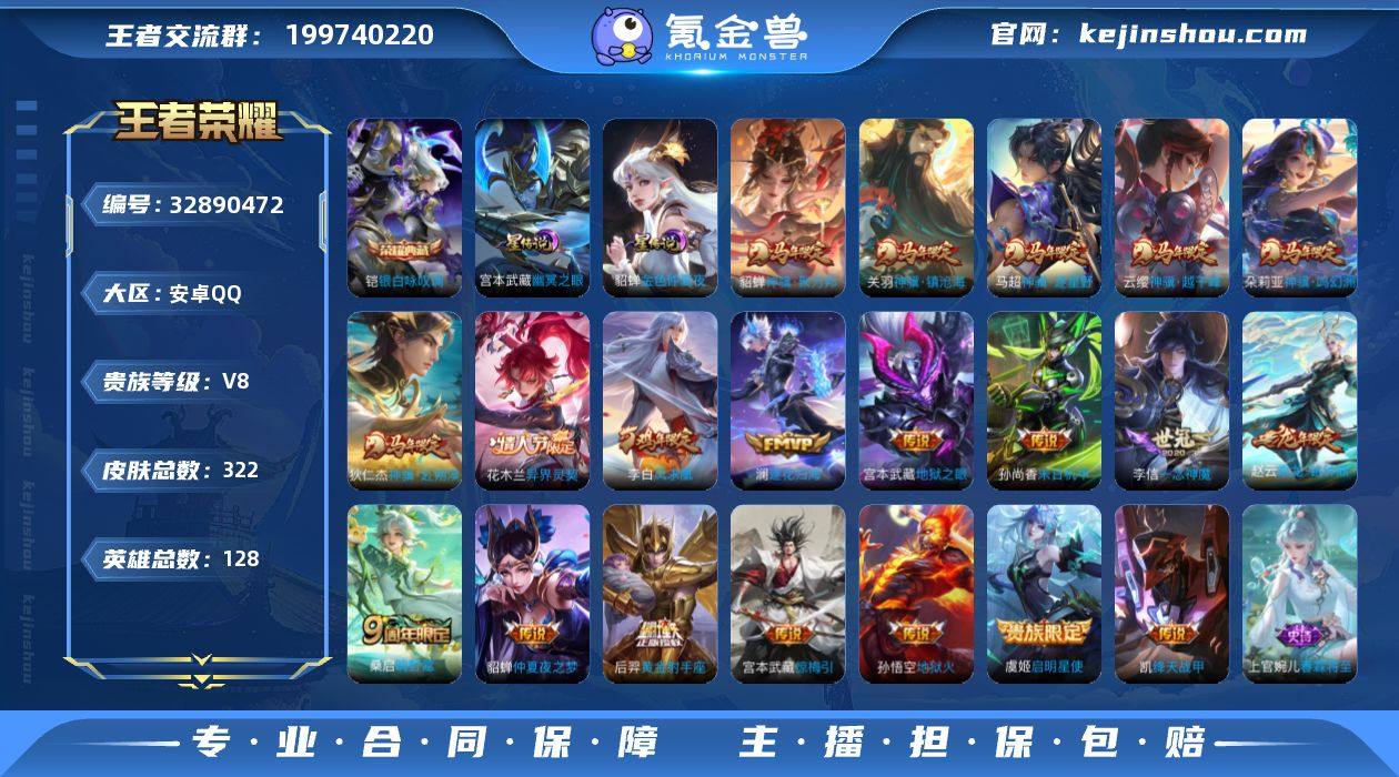 MCK632974 【凯典藏!马年全套!】 皮肤数量322 印记总数11 【V8】 【无双王者】 【暂时不可修改】 账号类型7 荣耀典藏1 星元皮肤2 传说20 史诗84 账号类型:上单号,打野号,射手号,软辅号,女号,全能号,中单号; 荣耀典藏:铠_银白咏叹调; 星元皮肤:宫本武藏_幽冥之眼,貂蝉_金色仲夏夜; 传说:澜_逐花归海,关羽_神骥·镇沧海,朵莉亚_神骥·鸣幻洲,貂蝉_神骥·聚万邦,铠_绛天战甲,马超_神骥·逐星野,狄仁杰_神骥·赴朔漠,云缨_神骥·越千峰,后羿_黄金射手座,花木兰_异界灵契,虞姬_启明星使,李信_一念神魔,宫本武藏_惊梅引,宫本武藏_地狱之眼,桑启_鸣野蒿,赵云_乘龙铭钟鼎,貂蝉_仲夏夜之梦,李白_凤求凰,孙悟空_地狱火,孙尚香_末日机甲; 史诗:明世隐_百晓客,雅典娜_黎明之约,上官婉儿_春霖将至,高渐离_天秀音浪,钟馗_锁墨魂,小乔_线条小狗,百里玄策_罗小黑战记,盘古_撼世英歌,周瑜_线条小狗,扁鹊_灵蛊蚀心,亚瑟_心灵战警,莱西奥_光弋星穹,女娲-万灵启世,嬴政_暗夜贵公子,刘禅_天才门将,狂铁_龙之律动,大乔_猫狗日记,妲己_女仆咖啡,张飞_乱世虎臣,鬼谷子_五谷丰年,孙策_猫狗日记,白起_星夜王子,百里守约_特工魅影,亚连_破空之剑,...