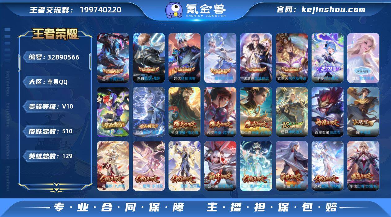 MCK632712 【挚爱+雪境双天幕!小乔+甄姬无双!】 皮肤数量510 印记总数19 【V10】 【最强王者】 【可修改】 账号类型7 天幕2 无双2 荣耀典藏6 珍品2 传说61 史诗156 账号类型:女号,中单号,射手号,打野号,上单号,全能号,软辅号; 天幕:天幕-雪境奇遇,天幕-挚爱童话; 无双:小乔_时之魔女,甄姬_雪境奇遇; 荣耀典藏:吕布_千魇归渊,伽罗_最初的交响,诸葛亮_星域神启,韩信_弑枪猎影,武则天_倪克斯神谕,李白_鸣剑曳影; 珍品:嫦娥_器灵落星盏,孙策_时之奇旅; 传说:云缨_神骥·越千峰,东皇太一_灼幽烈阳,关羽_神骥·镇沧海,狄仁杰_神骥·赴朔漠,梦奇_胖达荣荣,宫本武藏_地狱之眼,后羿_神树通天,李元芳_飞鸢探春,上官婉儿_妄想奇谈,西施_续相思,张良_黄金白羊座,杨玉环_星之鸣奏,达摩_黄金狮子座,干将莫邪_久胜战神,裴擒虎_祥瑞亨通,张飞_百相守梦,夏洛特_浮生妄,云缨_幻光神枪,女娲_愿照千秋盛,司空震_愿照山河定,虞姬_愿照岁时盈,蔡文姬_愿照福禄聚,妲己_愿照众生和,澜_愿照九州拓,后羿_千劫归真,嬴政_玄雷天君,王昭君_映山客,桑启_鸣野蒿,马可波罗_妄想实况,铠_绛天战甲,朵莉亚_心动手记,王昭君_星穹之声,墨子_黄金天蝎座,海...
