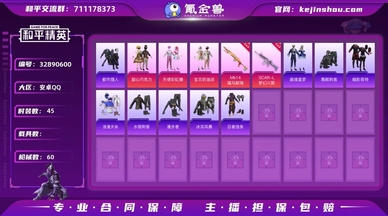 实名: 可修改 时装数: 45 枪械数: 60 热门装扮: 甜心巧克力,宝贝奶油派,天使彩虹糖,鹰眼刺客,都市猎人 稀有枪皮: SCAR-L梦幻火箭,MK14-福马献瑞