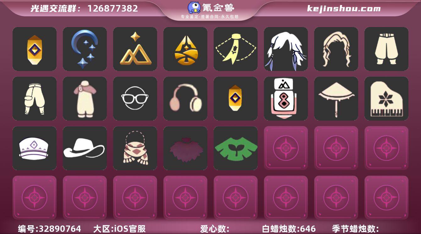 iOS官服 手机账号 1珍稀物品 4毕业季 4毕业图 646蜡烛 【珍稀物品】彩虹围巾(五塑彩带斗) 【季节已毕业】追忆季,夜行季,拾光季,归巢季 【完成地图】晨岛,云野,雨林,霞谷 【礼包】兔子(玉兔头饰)(玉兔发饰)(兔子发饰),四叶草(四叶草头饰) 【裤子】武士裤,背带裤,搓澡巾 【面具】夜行毕业面具(棕熊面具) 【面饰】黑框眼镜(粗框眼镜),红耳机 【项链】围巾(肩带) 【发型】虚荣,归巢毕业发型(五塑彩羽发),若笠(箬笠) 【头饰】平顶帽,蓝色音乐会(蓝色音乐符),牛仔帽(西部帽) 【斗篷】遥鲲斗篷(双翼遥鲲斗),粉红绒毛斗篷(绒毛斗篷),绿芽,海洋斗 【配饰】鲲灯(追忆之书),相机(季卡相机),雨伞,高音钢琴(白色高脚钢琴)