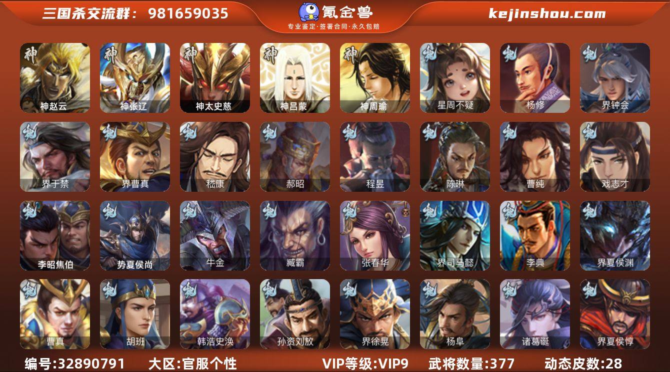 神赵云,神张辽,神太史慈,星周不疑,杨修,界钟会,界于禁,界曹真,嵇康,郝昭,陈琳,曹纯,戏志才,程昱,关索,马云騄,谋黄忠,谋赵云,诸葛瞻,张星彩,王平,沙摩柯,界黄忠,花鬘,董允,界徐盛,界步练师,贺齐,左慈,张让,苏飞,麹义,沮授,界李儒,卑弥呼,谋张角,许攸,兀突骨,神吕蒙,神周瑜,势夏侯尚,SP关羽,SP曹仁,SP蔡文姬,乐进,曹昂,诸葛诞,朱灵,文聘,SP姜维,张春华,钟会,曹冲,郭淮,满宠,界王异,界曹操,界司马懿,界夏侯惇,界张辽,界许褚,界郭嘉,李典,曹真,韩浩史涣,陈群,曹叡,曹休,钟繇,司马朗,王基,李通,郭皇后,孙资刘放,辛宪英,界甄姬,吕虔,鲁芝,蒯越蒯良,界典韦,界荀彧,界徐晃,杜畿,界曹丕,毌丘俭,界邓艾,张恭,界曹植,界满宠,界郭淮,卞夫人,辛毗,界陈群,华歆,蔡贞姬,袁涣,崔琰,毛玠,杨阜,谋徐晃,胡班,李昭焦伯,牛金,界夏侯渊,臧霸,唐咨,势陈到,SP孙尚香,关银屏,夏侯霸,马良,关兴张苞,廖化,界马岱,关平,简雍,刘封,界法正,界关兴张苞,界刘备,界关羽,界张飞,界赵云,界马超,SP徐庶,吴懿,周仓,张松,刘谌...