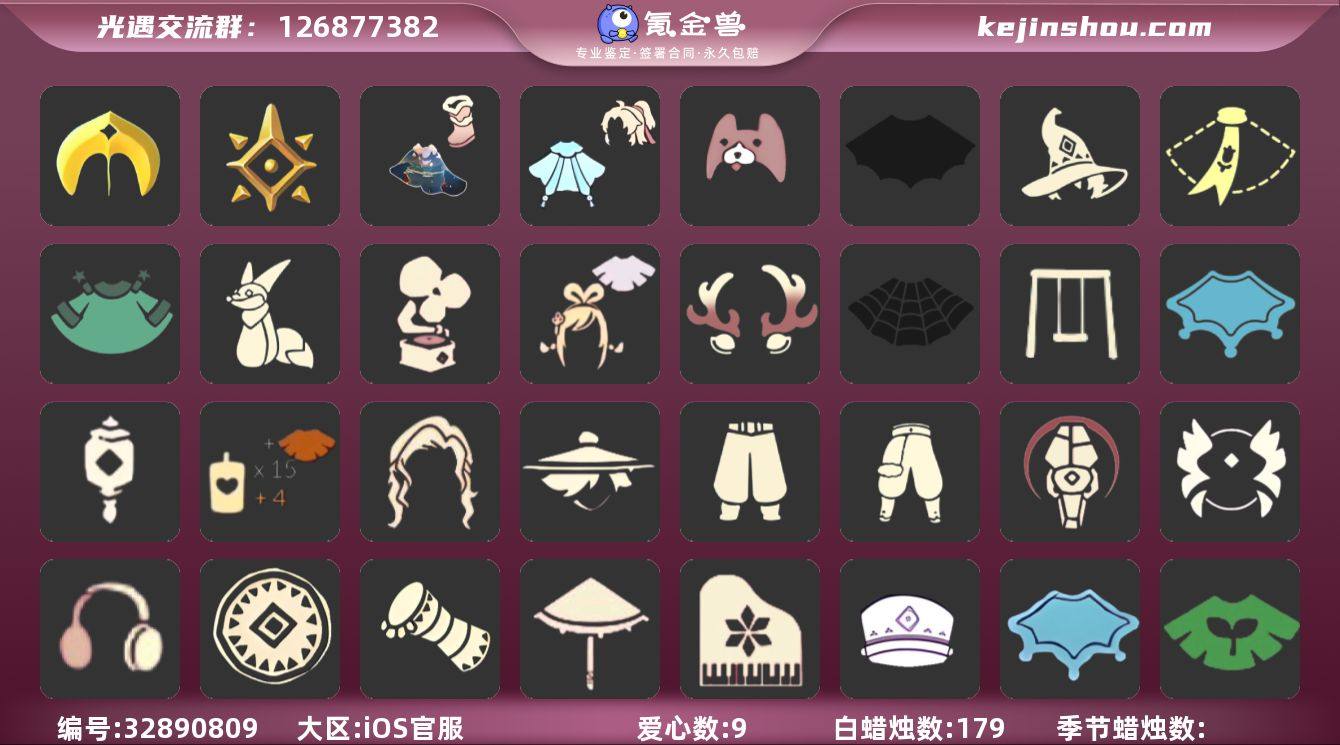 账号类型: 手机账号 季节已毕业: 圣岛季,预言季 完成地图: 晨岛,云野,雨林,霞谷,暮土,禁阁 珍稀物品: 鳐鲲斗篷,阿努比斯(狗头) 礼包: 蝙蝠套,巫师,围巾,星球斗,小狐狸,音乐桌,绊爱,鹿角,蜘蛛斗,秋千,瑞雪,灯笼,创始人,小狗周年发饰,潮汐套装礼包,青衫落拓礼包 裤子: 武士裤,搓澡巾 面具: 阿努比斯 面饰: 红耳机,青鸟毕业面饰 发型: 若笠,虚荣 头饰: 平顶帽 斗篷: 绿芽,瑞雪斗篷 配饰: 雨伞,高音钢琴,圆鼓,蓝色手碟 亮点: 【优质装备】:预言季,阿努比斯(狗头),武士裤,圣岛季,鳐鲲斗篷,高音钢琴(白色高脚钢琴),圆鼓(手拍大鼓),蓝色手碟(毕业手碟),青鸟毕业面饰(青鸟面饰),蝙蝠套(蝙蝠斗篷)(南瓜头),星球斗(星球夹克),潮汐套装礼包,音乐桌(网易云留声机),绊爱(绊爱斗篷)(绊爱礼包),秋千(情人秋千),红耳机,围巾(小王子斗篷)(小王子围巾),鹿角(圣诞鹿角),蜘蛛斗(蛛丝斗篷)(蛛网斗篷),瑞雪(瑞雪斗篷)(暖冬瑞雪),灯笼(中秋灯笼),巫师(巫师帽),小狐狸(狐狸背包),晨岛,云野,雨林,霞谷,墓土(暮土),禁阁,若笠(箬笠),创始人(创始人斗篷),小狗周年发饰(小狗周年头饰),青衫落拓礼包
