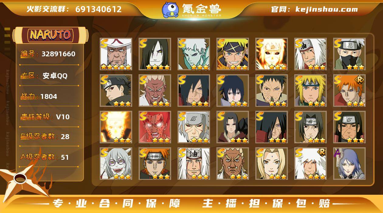 【火影忍者】战斗力:1804W+;段位:暗部2阶;本服排名:59;VIP:V10级;S忍:28个;A忍:51个;通灵兽:20个,S忍:十尾人柱力宇智波带土|秽土转生解宇智波斑|白面具宇智波斑|忍界大战宇智波带土|须佐能乎旗木卡卡西|秽土转生千手扉间|超佩恩天道|九喇嘛连结波风水门|天道佩恩|传说中的三忍自来也|漩涡鸣人宇智波佐助|须佐能乎宇智波止水|秽土转生千手柱间|秽土转生宇智波鼬|永恒万花筒宇智波佐助|忍界大战艾|舞之豪杰自来也|大蛇丸(普通) * 4星|纲手(普通)|波风水门|秽土转生宇智波斑|须佐能乎宇智波鼬|四代目雷影艾|仙人模式药师兜|死门迈特凯|九喇嘛连结漩涡鸣人|猿飞日斩(普通) * 5星|自来也(普通)__A忍:青春爆炸迈特凯|仙人模式巳月|忍界大战李洛克|忍界大战日向宁次|四代目土影黑土|木叶上忍猿飞木叶丸|秽土转生迪达拉|宇智波止水(普通)|新春限定宇智波止水|不风|忍界大战奇拉比|青年波风水门|青年艾|漂泊武士千手扉间|近松十人卫千代|半蛇斗篷药师兜|须佐能乎宇智波佐助|九尾查克拉漩涡鸣人|暴怒宇智波带土|晓大蛇丸|百豪春野樱|忍界大战秋道丁次|新春限定宇智波鼬|奇拉比(普通)|万花筒写轮眼宇智波佐助|五代目雷影达鲁伊|死司凭血飞段 * 5星|疾风传我爱...