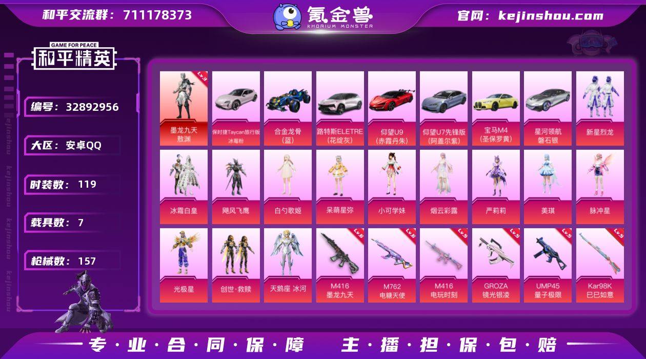 安卓手Q H-KWF199【1神装14粉装7特效枪7载具4粉色飞行器 三级敖渊 红眼罩/8号机/Mark.06/新星烈龙/冰霜白皇/飓风飞鹰/白勺/呆萌星弥/小可学妹/烟云彩露/严莉莉/美琪/脉冲星/光极星/创世·救赎/天鹅座 冰河/迎夏光舞/奶油梦幻熊/童真绒兔/冰公主/银尘】63689热力值-8王牌印记-119套装-157枪皮 【红色神装等级】:墨龙九天-敖渊(三级) 【红色角色神装】:墨龙九天-敖渊 【热门品类】:套装-龟仙人,套装-暗影哥特,角色-8号机,角色-Mark.06 【粉色套装】:粉装-