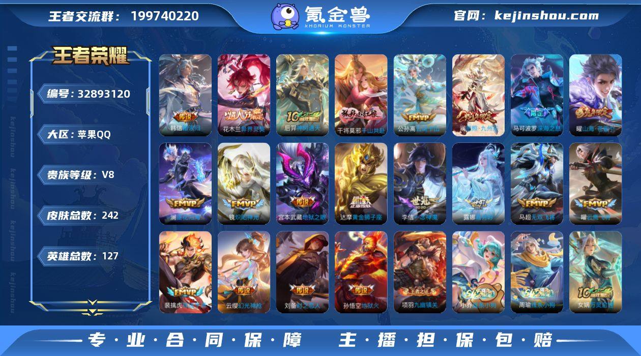 【v8 242皮 20传说 1星传说】实名: 可修改 贵族等级: V8 英雄数: 127 皮肤数: 242 传说皮: 黄金狮子座,云鹰飞将,炽阳神光,一念神魔,地狱火,地狱之眼,时之恋人-刘备,无双飞将,山海·苍雷引,霜月吟,澜逐花归海,幻光神枪,祥瑞亨通,云诺千山,千山共赴,神树通天,异界灵契-花木兰,踏浪归 限定皮: 李小龙,深海之息,五谷丰年,愿照·九州拓
