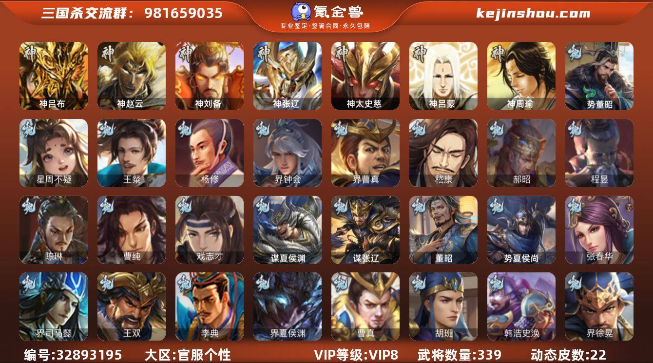 【14789894】官阶:大将军;VIP等级:VIP8;史诗武将数量:32;动态皮肤数量:22;武将总数:339;史诗宝珠数量:0;将魂数量:1290;神将:5;魏国史诗武将:20;蜀国史诗武将:6;吴国史诗武将:2;群史诗武将:7