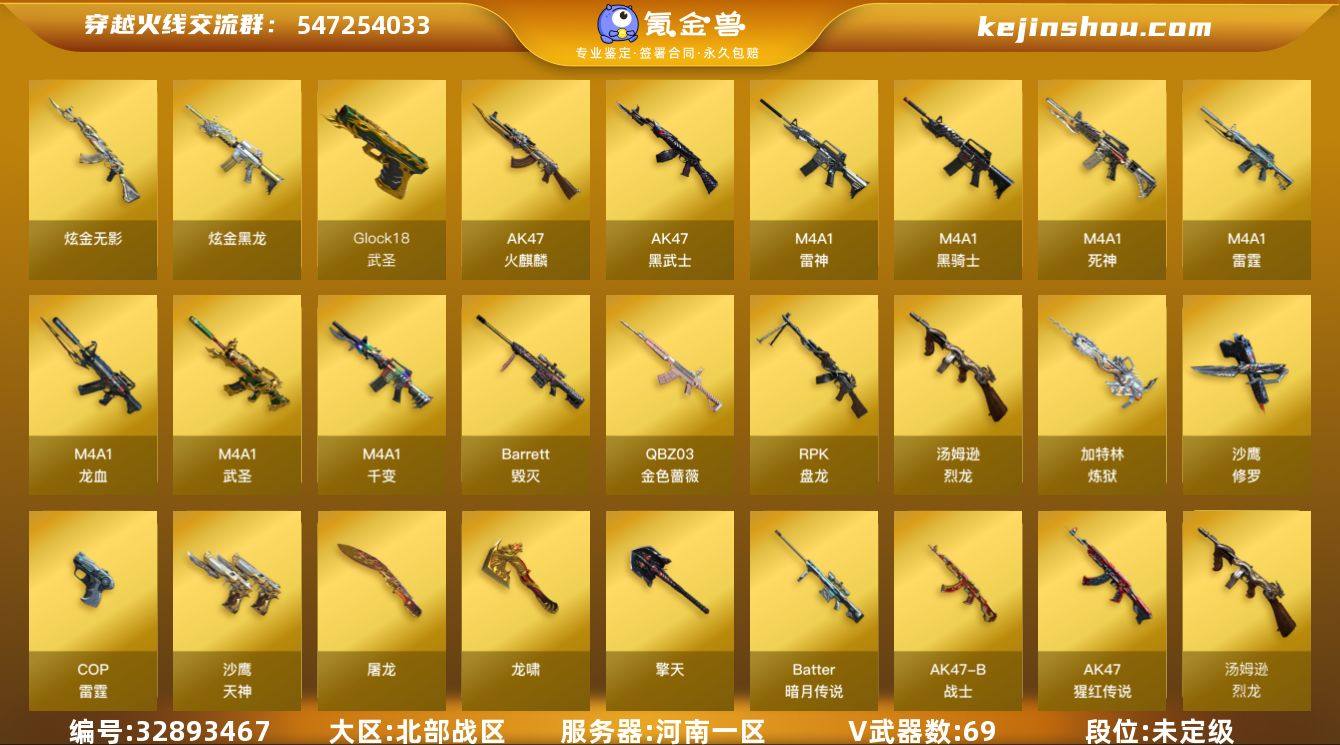 实名: 可修改 排位资格: 有 V武器: AK47-火麒麟,AK47-黑武士,M4A1-雷神,M4A1-黑骑士,M4A1-死神,M4A1-雷霆,M4A1-龙血,M4A1-武圣,M4A1-千变,Barrett-毁灭,QBZ03-金色蔷薇,RPK-盘龙,汤姆逊-烈龙,加特林-炼狱,沙鹰-修罗,COP雷霆,沙鹰-天神,屠龙,龙啸,擎天,Barrett-暗月传说,AK47-B-战士,AK-47-猩红传说,烈龙,盘龙,Glock18-武圣 炫金武器: 炫金无影,炫金黑龙 狙击枪稀有皮肤: 毁灭耀金皮肤,毁灭-星空 英雄角色: 王者-零,炫 音效道具: Barrett-毁灭音效卡,M4A1-黑骑士音效卡