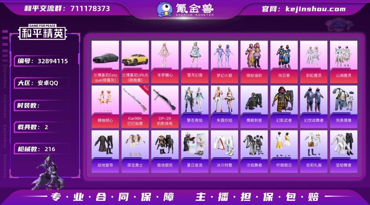 【地铁满天赋 猪妹 新101】c28821-【无二次协助处理】【因赛季更新游戏段付以上号为准!】 安卓Q-2载具8粉装4特效枪14热门170套装216枪皮 12印记 历史超级王牌15星 【2载具】 兰博轿车灰色 兰博SUV黄色 【8粉装】 梦幻火箭 雪月幻音 羊梦糖心 绝对恒星 缤纷油彩 橘柚倾心 山涧鹿灵 彩虹鹿灵 【4特效枪】 Kar98K-巳巳如意 (5级) DP-28-豹影疾电 (5级) M249-绝对恒星 (7级) Mk14-福马献瑞 (5级) 【14热门】 鹰眼刺客 梦起落英 暗影哥特 团圆交子 瑞龙福将 粉红小猪 狂沙舞者 薄荷蓝莓 抹茶蜜豆 破蛋小黄鸡 极速红龙 M762-瑞龙福将 47-林间仙鹿 GROZA-林间仙鹿 【1飞行器】 梦幻火箭飞行器 【2头盔】 梦幻火箭头盔 夏日绵绵冰头盔 【1背包】 夏日绵绵冰背包