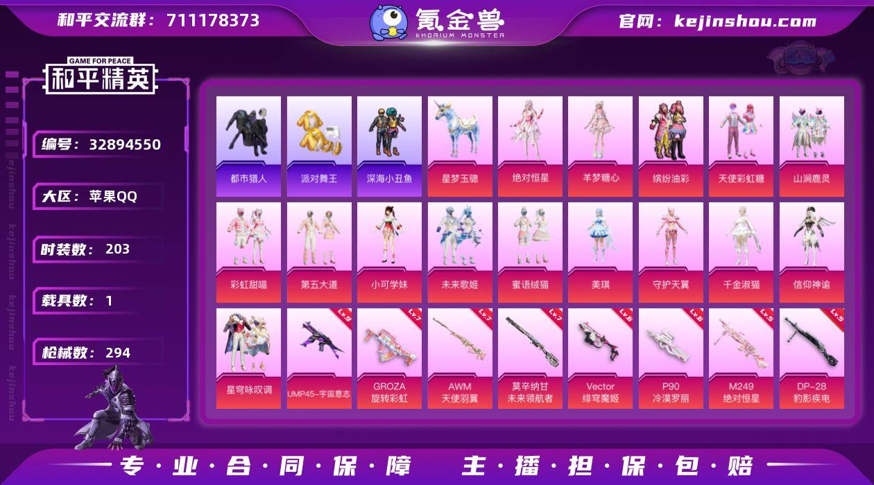 全裙子公主号【店主推荐捡漏号!可直接换绑】苹果 手Q-18粉装-16特效枪-1载具-10粉色飞行器-104819热力值-16王牌印记-203套装-294枪皮 【热门品类】:粉装-缤纷油彩,套装-浪漫天命,套装-都市猎人,套装-派对舞王,套装-深海小丑鱼,套装-龟仙人,套装-暗影哥特,套装-糯粉咩咩,套装-软软马卡龙,套装-红熊茄茄 【粉色套装】:角色-绝对恒星,粉装-天使彩虹糖,粉装-缤纷油彩,粉装-山涧鹿灵,粉装-彩虹甜喵,粉装-第五大道,角色-小可学妹,粉装-未来歌姬,粉装-蜜语绒猫,角色-美琪,角色-守护天翼,角色-千金淑猫,角色-信仰神谕,粉装-星穹咏叹调,角色-羊梦糖心,角色-罪夜之冕,人物-小舞·灵珑,人物-小舞·雪昙 【粉色枪皮等级】:AKM-绿萝繁花(五级),SCAR-L-锦绣绵绵(五级),GROZA-旋转彩虹(七级),UMP45-宇宙意志(九级),Vector-绯穹魔姬(六级),AKS-74U-森灵之息(五级),P90-冷漠罗丽(六级),Kar98K-巳巳如意(五级),AWM-天使羽翼(七级),Mk14-福马献瑞(五级),莫辛纳甘-未来领航者(七级),M417-第五大道(二级),SPAS-12-蜜语绒猫(五级),M249-绝对恒星(五级),DP-28-豹影疾电(五级),信号枪-金乌曜日(三级) 【粉色载具】:星梦玉骢 【粉色枪皮】:AKM-绿萝繁花,...