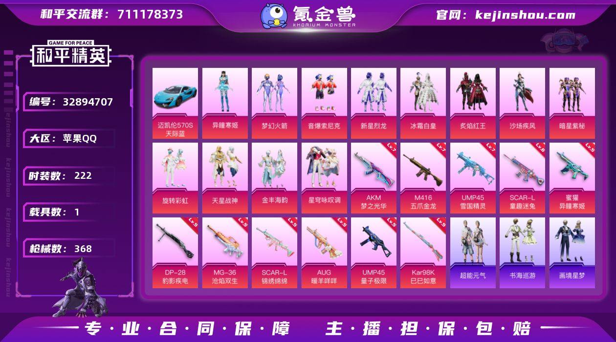 【店主推荐捡漏号!可直接换绑】苹果 手Q-12粉装-14特效枪-1载具-7粉色飞行器-110802热力值-19王牌印记-222套装-368枪皮【热门品类】:粉装-梦幻火箭,粉装-音爆索尼克,套装-浪漫天命,角色-军刀雅典娜,套装-龟仙人,套装-暗影哥特,角色-Mark.06,套装-红熊茄茄【粉色套装】:粉装-梦幻火箭,粉装-新星烈龙,粉装-冰霜白皇,粉装-炙焰红王,粉装-沙场疾风,粉装-暗星紫秘,粉装-旋转彩虹,粉装-音爆索尼克,粉装-天星战神,粉装-金丰海韵,粉装-星穹咏叹调,角色-异瞳寒姬【粉色枪皮等级】:AKM-梦之光华(七级),SCAR-L-童趣迷兔(六级),SCAR-L-锦绣绵绵(五级),M416-五爪金龙(七级),AUG-暖羊咩咩(五级),蜜獾-异瞳寒姬(五级),ACE32-萌骑漫游(四级),UMP45-雪国精灵(七级),UMP45-量子极限(五级),AKS-74U-森灵之息(四级),Kar98K-巳巳如意(五级),Mk14-福马献瑞(五级),DP-28-豹影疾电(五级),MG-36-沧焰双生(五级)【粉色载具】:迈凯伦570S(天际蓝)【粉色枪皮】:AKM-梦之光华,SCAR-L-童趣迷兔,SCAR-L-锦绣绵绵,M416-五爪金龙,AUG-暖羊咩咩,蜜獾-异瞳寒姬,ACE32-萌骑漫游,UMP45-雪国精灵,UMP45-量子极限,AKS-74U-森灵之息,Kar98K-巳巳如意,Mk14-福马献瑞...