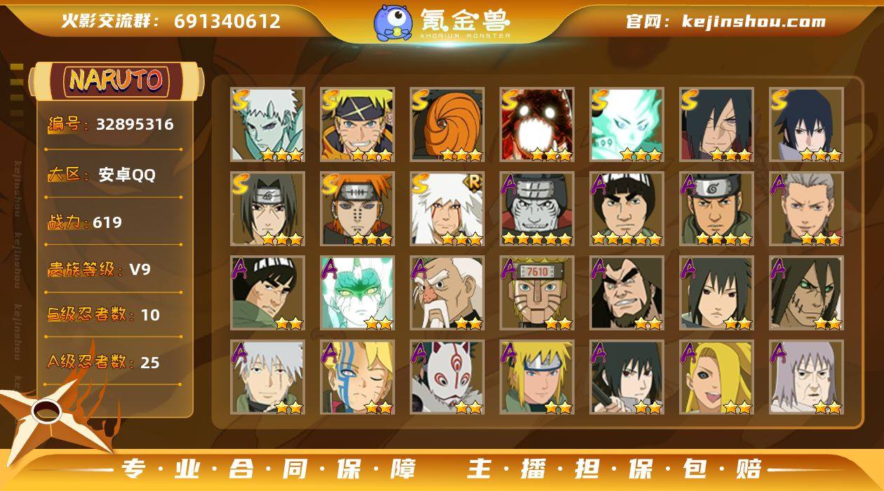 【HYX3684】V9/战力619W/S忍10/A忍25/二星A-大野木「侠隐江湖」/三星S-宇智波带土「十尾人柱力」/二星A-飞段「死司凭血」/二星A-宇智波鼬/三星S-宇智波佐助「永恒万花筒」/2星小南「神驹佑将」/三星A-飞段/二星A-蝎/三星S-佩恩「天道」/三星S-漩涡鸣人·宇智波佐助/三星S-大筒木舍人 「最终章」/二星A-秋道丁次「忍界大战」/二星A-角都「秽土转生」/五星A-迈特凯/二星A-漩涡博人「桃式显现」/二星A-神秘面具男 「忍者之路」/2星旗木卡卡西「神威对决」/二星A-波风水门 「青年」/四星A-猿飞阿斯玛/三星S-自来也「舞之豪杰」/三星S-漩涡鸣人 「暴怒·第六尾」/二星A-迪达拉「秽土转生」/二星A-神农 「羁绊」/二星A-宇智波泉奈/二星A-迪达拉/二星A-旗木卡卡西 「幻之真容」/二星A-巳月「仙人模式」/三星S-宇智波斑「秽土转生·解」/二星A-迈特凯「青春爆炸」/二星A-宇智波佐助「须佐能乎」/三星S-宇智波斑「五影会谈」/五星A-干柿鬼鲛/二星A-机械鸣人「初始形态」/二星A-千代「近松十人卫」/三星S-宇智波鼬 「须佐能乎」
