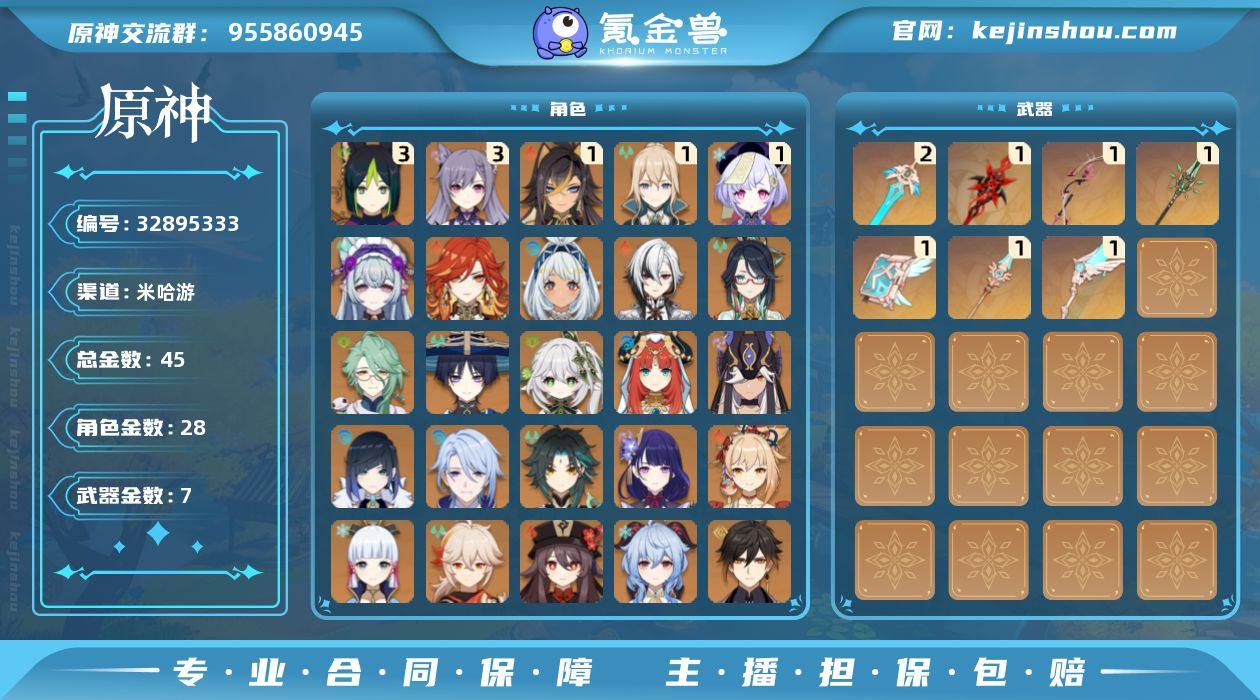 邮箱: 不送邮/死邮 总黄数: 45 冒险等级: 59 3命金色角色: 三命刻晴,三命提纳里 1命金色角色: 一命七七,一命琴,一命迪希雅 0命金色角色: 迪卢克,枫原万叶,神里绫华,宵宫,达达利亚,钟离,莫娜,甘雨,魈,胡桃,雷电将军,神里绫人,夜兰,赛诺,妮露,纳西妲,流浪者,白术,闲云,阿蕾奇诺,玛拉妮,玛薇卡,梦见月瑞希 拥有武器: 天空之翼,天空之卷,和璞鸢,天空之刃,天空之脊,最初的大魔术,赤月之形 2精武器: 天空之刃 1精武器: 天空之翼,天空之卷,和璞鸢,天空之脊,最初的大魔术,赤月之形