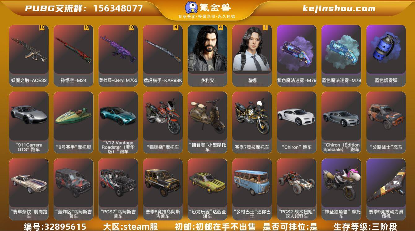 枪皮满级3把未满级1把:1.满级762美杜莎+金色异色 2.满级ace妖魔之触+黄蓝异色 3.满级m24孙悟空 3.3级猛虎98k 图纸和齿轮若干可自行兑换 烟雾弹烟雾枪各种颜色不等 载具:跑车1.豪华布加迪威龙各种颜色应有尽有,2.跑车保时捷911,3.四轮suv保时捷卡宴,4.四轮轿车帕拉梅拉,5.摩托杜卡迪,两个特殊人物:4级多利安差一个碎片满级,1级翰娜 工坊制作币3万+ 还有各种服饰各种背包各种配饰各种舞蹈乱七八糟一大堆应有尽有。