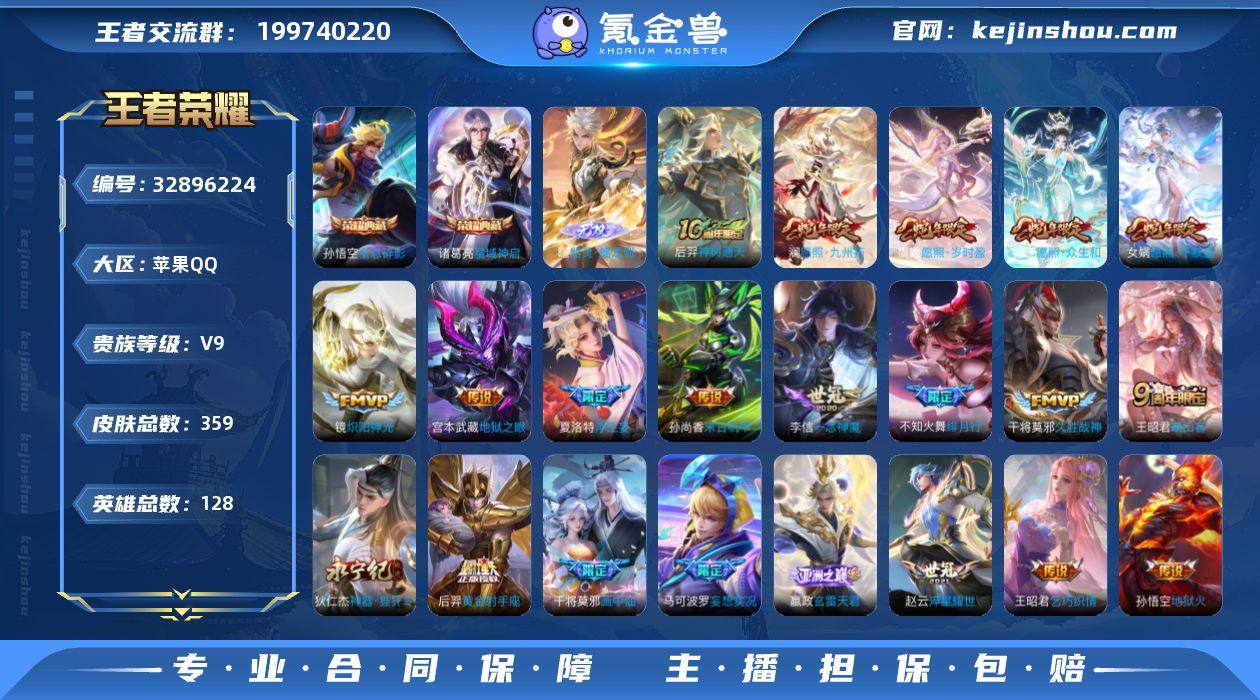 苹果Q-V9-最强王者段位-128英雄-359皮肤-2典藏皮肤-1无双-23传说-97史诗 【英雄全皮】:孙权全皮,鬼谷子全皮,戈娅全皮,空空儿全皮 【荣耀典藏】:孙悟空全息碎影,诸葛亮星域神启 【无双皮肤】:曜器灵螭龙剑 【传说皮肤】:后羿神树通天,女娲愿照千秋盛,妲己愿照众生和,澜愿照九州拓,虞姬愿照岁时盈,嬴政玄雷天君,王昭君映山客,马可波罗妄想实况,夏洛特浮生妄,干将莫邪画中仙,狄仁杰神器狴犴令,不知火舞绯月行,赵云淬星耀世,王昭君乞巧织情,小乔音你心动,镜炽阳神光,虞姬启明星使,李信一念神魔,干将莫邪久胜战神,后羿黄金射手座,孙尚香末日机甲,宫本武藏地狱之眼,孙悟空地狱火 【限定皮肤】:姜子牙天穹之誓,李白谪仙醉月,狄仁杰阴阳师,赵云皇家上将,墨子神迹守卫,孙尚香蔷薇恋人,鲁班七号狮舞东方,阿轲迷踪丽影,钟无艳王者之锤,钟无艳超时空战士,周瑜赤莲之焰,元歌无心,夏侯惇朔风刀,甄姬游园惊梦,甄姬落雪兰心,马可波罗暗影游猎,马可波罗山海玄木吟,马可波罗妄想实况,狄仁杰魔术师,狄仁杰万华元夜,狄仁杰神器狴犴令,达摩沙漠行僧,项羽海滩派对,老夫子醍醐杖,老夫子航海奇遇记,程咬金演武夺筹,刘邦夺宝奇兵,韩信傲雪梅...