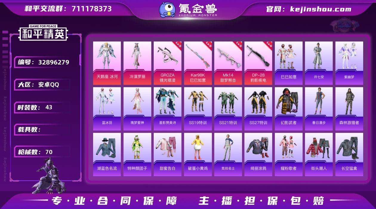 安卓 手Q-2粉装-5特效枪-0载具-1粉色飞行器-20822热力值-1王牌印记-43套装-70枪皮 【粉色套装】:角色-天鹅座 冰河,角色-冷漠罗丽 【粉色枪皮等级】:GROZA-镜光银凌(五级),Kar98K-巳巳如意(五级),Mk14-甜梦熊击(五级),DP-28-豹影疾电(四级),PKM-萌骑夺宝(二级) 【粉色枪皮】:GROZA-镜光银凌,Kar98K-巳巳如意,Mk14-甜梦熊击,DP-28-豹影疾电,PKM-萌骑夺宝 【粉色飞行器】:炫彩糖果飞行器 【粉色降落伞】:星穹咏叹调降落伞,幻星舰长降落伞,冷漠罗丽降落伞,炫彩糖果降落伞 【稀有套装】:套装-巳巳如意,套装-炫彩糖果,角色-许七安,套装-紫幽梦,套装-蓝冰羽,角色-瑰梦爱神,套装-星影赞美诗,角色-月烬之祷 【稀有枪皮】:M79短管榴弹-钛晶裂爪,AUG-冰晶雪宝,M16A4-最终圣卫者,SCAR-L-玉兔迎春,M416-蓝色火焰,AUG-天降萌叽,M762-天降萌叽,M762-彩虹符号,G36C-星穹咏叹调,AC-VAL-天降萌叽,蜜獾-天降萌叽,UZI-天降萌叽,Vector-暗夜玫瑰,P90-巳巳如意,Kar98k-最终圣卫者,M24-歌者泠鸢,SKS-炫彩节奏,Mini14-炫彩节奏,S686-彩虹符号,S686-生命誓言,S686-巳巳如意,DBS-月影灵韵,M249-糯团青竹,M249-绯穹魔姬,DP-28-彩虹符号,MG3-幻世战舞...