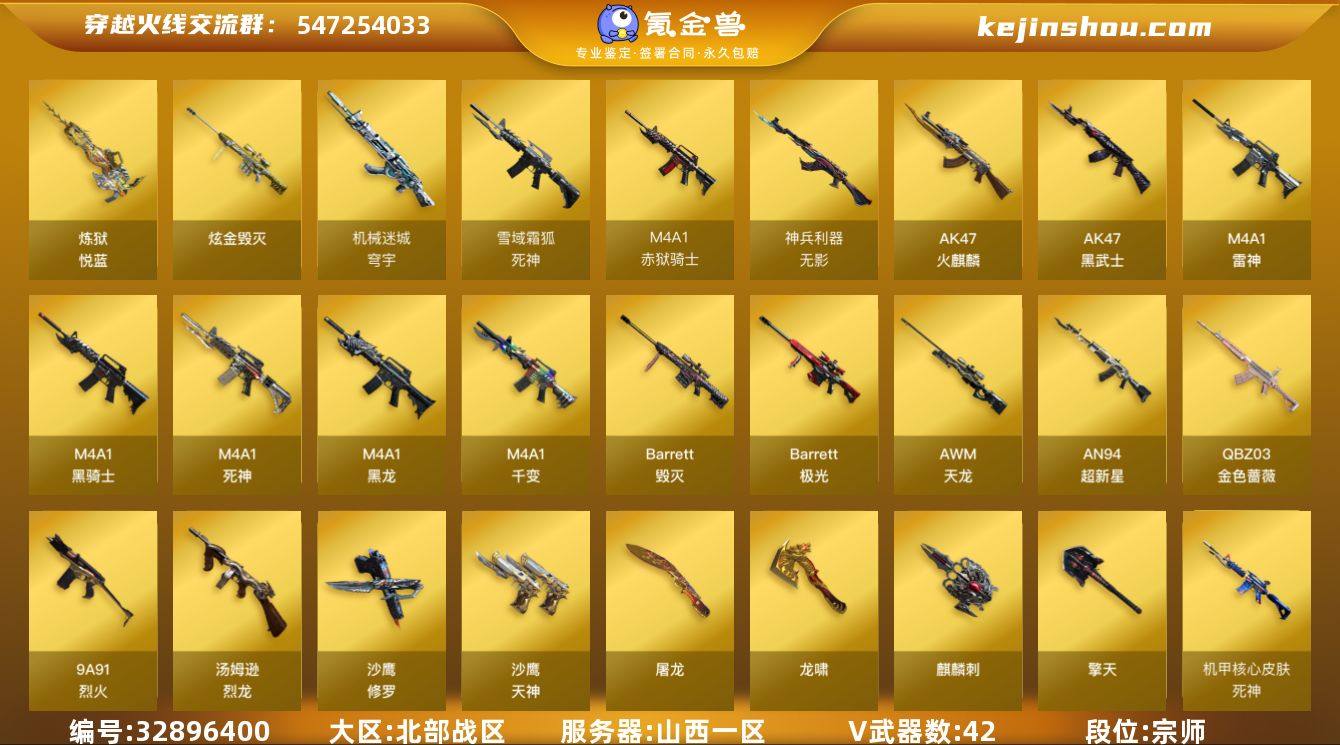 【ky6588】山西一区-43V-1王者武器数-1炫金武器数 【热门武器】:QBZ03-金色蔷薇,死亡之眼,毒蜂,M4A1-黑骑士*2,汤姆逊-烈龙*6,沙鹰-修罗*4 【王者炫金武器】:炼狱-悦蓝,炫金毁灭 【音效卡】:死神-雪域霜狐-怀旧音效卡 【皮肤】:裁决-运输船 皮肤,雷神-暗月,雷神-能量核心*2,雷神-星空,雷神-R.LGD-CFPLS18冠军,雷神-源计划2.0专属 皮肤,火麒麟-平天大圣,火麒麟-百城,火麒麟-心动糖果,毁灭-暗月,毁灭-航天科技皮肤,毁灭-虹光风暴 皮肤,毁灭-英雄计划 皮肤,M4A1-千变-孔明皮肤,黑龙-能量核心,黑龙-暗月,死神-机甲核心皮肤,天龙-秘银,修罗-能量核心*2,屠龙-春桃 皮肤,屠龙-惊鸿 皮肤,麒麟刺-甜蜜糖果 皮肤,麒麟刺-萌杀皮肤,麒麟刺-月皮肤 【角色】:审判者,狐影,雪域霜狐,修道士,空,暗夜-X,芳心审判者,虎妞,嘉年华灵狐,娟娟,兰妹妹,猎狐者-追月,零-水下丽影,灵狐-花神,灵狐者-X,灵狐者-黄金海岸,麻雀,玫瑰花神,萌儿,潘多拉-X,潘多拉-甜心教官,青霞仙子,斯沃特-X,蜀雪,兔囡囡,新娜塔莎,雪莉杨-摸金校尉,夜玫瑰-幻能朋克,影武者-X 【人偶武器】:巴雷特-零-水下丽影,AWM-灵狐-15周年嘉年华 【暴走生化】:毒蜂,死亡...