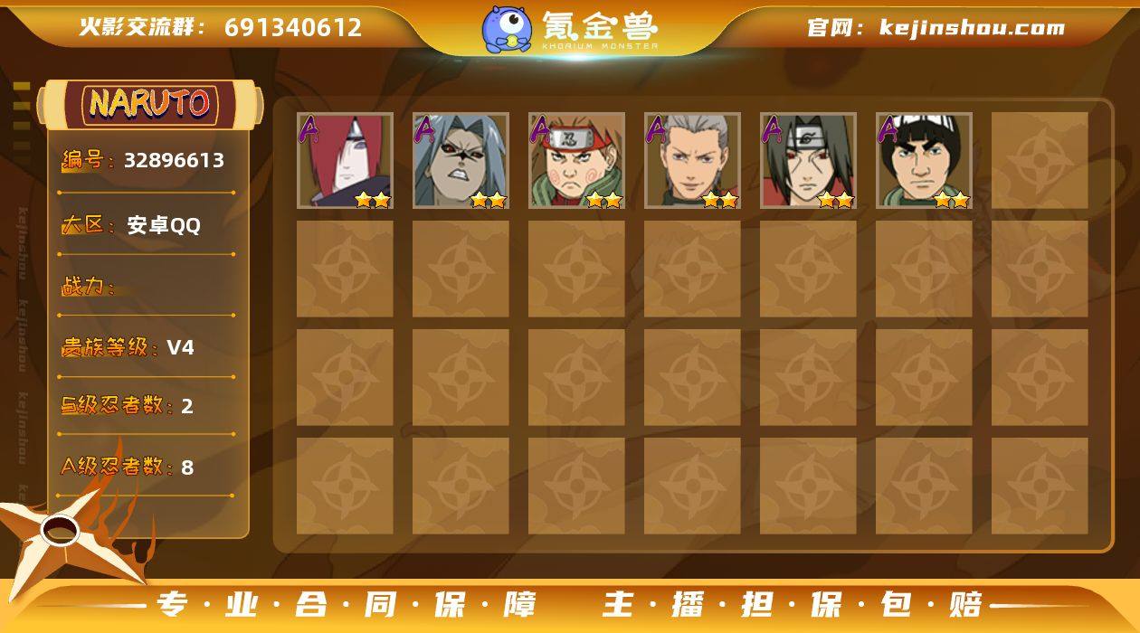 实名: 不可修改 贵族等级: V4 S忍数: 2 A忍数: 8 亮点: 【HYC1738】V4/S忍2/A忍8/二星A-秋道丁次「忍界大战」/二星A-宇智波鼬/二星A-迈特凯/二星A-长门「青年」/二星A-宇智波佐助「疾风传咒印」/二星A-飞段