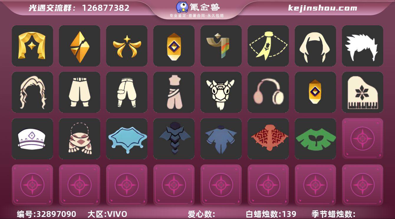 VIVO 手机账号 2珍稀物品 5毕业季 6毕业图 139蜡烛 【珍稀物品】白枭(帝企鹅发),透明蝶翼斗【季节已毕业】表演季,破晓季,欧若拉季(欧若拉),追忆季,彩染季【完成地图】晨岛,云野,雨林,霞谷,墓土(暮土),禁阁【礼包】兔子鞋(兔子拖鞋),雪人鞋(圣诞雪人靴),姆明饰品套装(姆明尾巴),巫师(巫师帽),绊爱(绊爱斗篷)(绊爱礼包),橘子(大橘大利),雪花(雪花发夹),兔子(玉兔头饰)(玉兔发饰)(兔子发饰),四叶草(四叶草头饰),新年耳钉(金鳞耳饰),枯角(巫树犄角),鹿角(圣诞鹿角),围巾(小王子斗篷)(小王子围巾),蝙蝠套(蝙蝠斗篷)(南瓜头),透明蛛丝(透明蜘蛛斗),瑞雪(瑞雪斗篷)(暖冬瑞雪),红伞(瑞气纸伞),献瑞折扇礼包【裤子】蓝绿裤(高领舞服),武士裤,搓澡巾【面具】黄眉企鹅面具,辉光羚羊面具【面饰】红耳机【项链】围巾(肩带)【发型】小王子发型,留辫蘑菇头,虚荣,若笠(箬笠)【头饰】平顶帽,蓝色音乐会(蓝色音乐符)【斗篷】冥龙斗篷,燕尾斗篷,遥鲲斗篷(双翼遥鲲斗),瑞雪斗篷,彩染围巾斗篷,绿芽,海洋斗【配饰】鲲灯(追忆之书),高音钢琴(白色高脚钢琴)