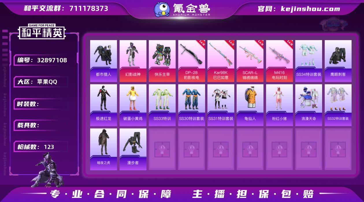苹果Q 可二次 2稀有1粉装7特效枪8热门112套装123枪皮 36210热力值 7印记 历史绝世王牌24星 都市猎人 浪漫天命 幻影战神 SCAR-L-锦绣绵绵 (5级) M416-电玩时刻 (5级) AKS-74U-森灵之息 (5级) Kar98K-巳巳如意 (5级) DP-28-豹影疾电 (5级) Mk14-福马献瑞 (3级) ACE32-萌骑漫游 (5级) 龟仙人 暗夜之虎 鹰眼刺客 暗夜之虎 粉红小猪 漫步者 破蛋小黄鸡 极速红龙 天之羽翼飞行器 幻影战神头盔 幻影战神背包 和平精英账号