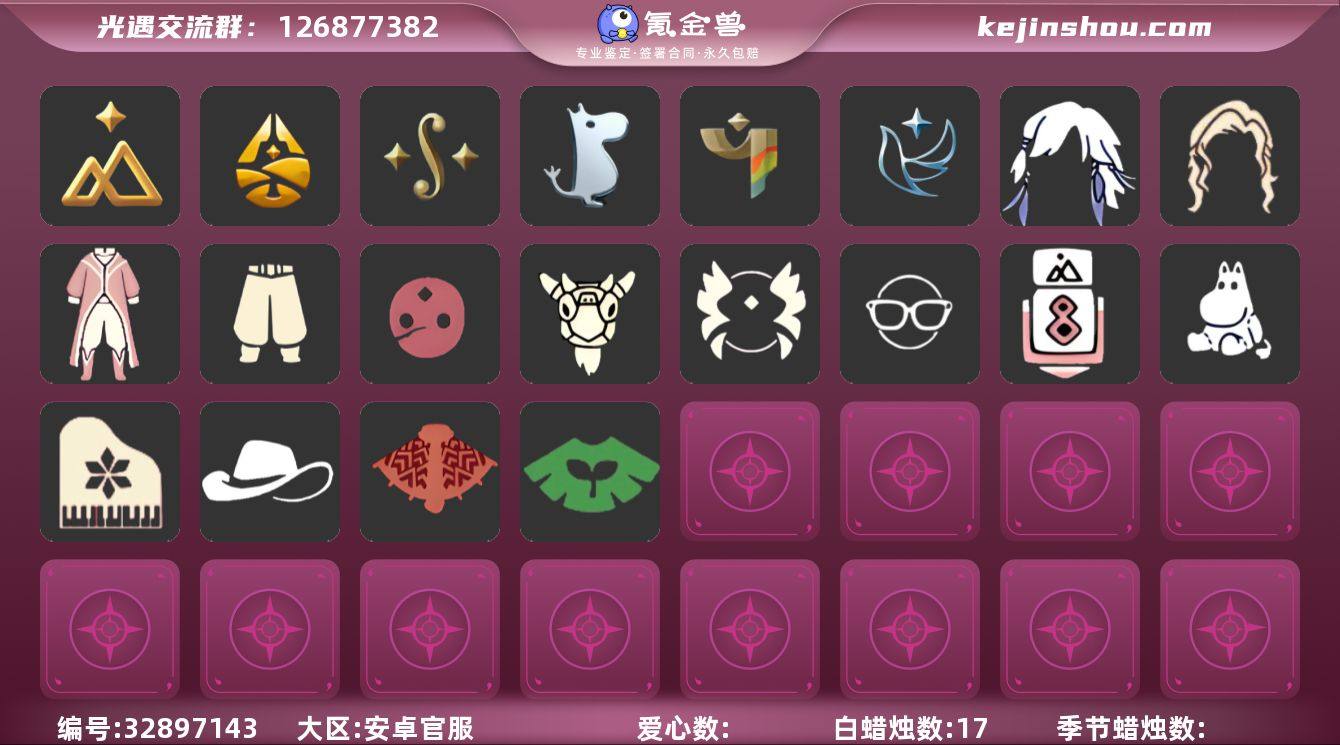 安卓官服 手机账号 1珍稀物品 8毕业季 17蜡烛 【珍稀物品】彩虹围巾(五塑彩带斗)【季节已毕业】拾光季,归巢季,二重奏季,姆明季,彩染季,青鸟季,迁徙季,织光季【礼包】巫师(巫师帽),小狗周年发饰(小狗周年头饰),锦标赛桂冠,心心相印发饰礼包,四叶草(四叶草头饰),云音伴游耳机,妮妮斗篷(姆明妈妈手作斗篷)(姆妈手作斗篷礼包),福娃(福娃礼包)(春之日礼包)(铜钱斗),线框斗篷礼包(周年线框斗篷),瑞雪(瑞雪斗篷)(暖冬瑞雪),风之旅人(风之旅人礼包),青衫落拓礼包,献瑞折扇礼包,魔法棒(惊喜手杖)(仙女棒),秋千(情人秋千),仙境茶会门扉礼包【裤子】青鸟尊贵蓬头裤子(蓝色燕尾服),妮妮裙子(妮妮长裙),武士裤【面具】辉光羚羊面具,裂纹面具【面饰】黑框眼镜(粗框眼镜),青鸟毕业面饰(青鸟面饰)【发型】虚荣,归巢毕业发型(五塑彩羽发),若笠(箬笠)【头饰】牛仔帽(西部帽)【斗篷】青鸟毕业斗篷(青鸟斗篷),彩染围巾斗篷,绿芽【配饰】相机(季卡相机),小红伞(姆明红伞)(姆明大伞),姆明抱枕,二重奏挂画(合奏挂画),高音钢琴(白色高脚钢琴)