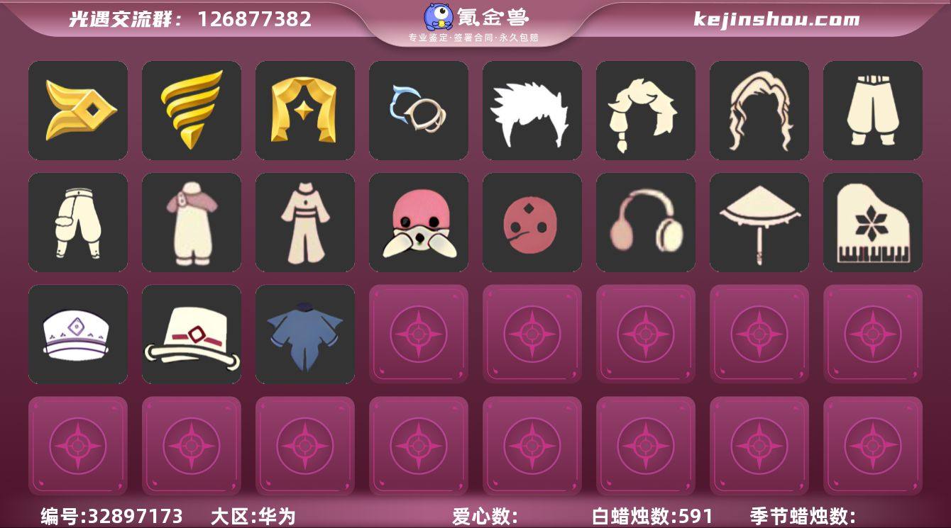 华为 手机账号 1珍稀物品 5毕业季 5毕业图 591蜡烛 【珍稀物品】白枭(帝企鹅发)【季节已毕业】风行季,潜海季,表演季,双星季,织光季【完成地图】晨岛,云野,雨林,霞谷,墓土(暮土)【礼包】兔子鞋(兔子拖鞋),水母(水母肩饰),活力海牛礼包,巫师(巫师帽),绊爱(绊爱斗篷)(绊爱礼包),橘子(大橘大利),雪花(雪花发夹),贝壳(贝壳发饰),兔子(玉兔头饰)(玉兔发饰)(兔子发饰),心心相印发饰礼包,四叶草(四叶草头饰),鹿角(圣诞鹿角),蝙蝠套(蝙蝠斗篷)(南瓜头),猫套(皮皮猫斗)(皮皮猫礼包),透明蛛丝(透明蜘蛛斗),瑞雪(瑞雪斗篷)(暖冬瑞雪),白绒金(白雪斗篷),吉他(音韵吉他)(白吉他),茶桌(花憩茶桌),南瓜(冥龙南瓜)【裤子】王子服(小王子套装),武士裤,背带裤,搓澡巾【面具】黄眉企鹅面具,呼吸面具(潜水面具),裂纹面具【面饰】红耳机【发型】小王子发型,单侧绑发(单边小辫),虚荣,若笠(箬笠)【头饰】平顶帽,蓝色音乐会(蓝色音乐符),行军锅头盔(六边锅帽子)(双耳锅帽子),羽毛发饰(多羽发饰)【斗篷】燕尾斗篷,黄色连帽披风(连帽斗篷)(斜边队长斗篷),海洋斗【配饰】雨伞,高音钢琴(白色高脚钢琴)