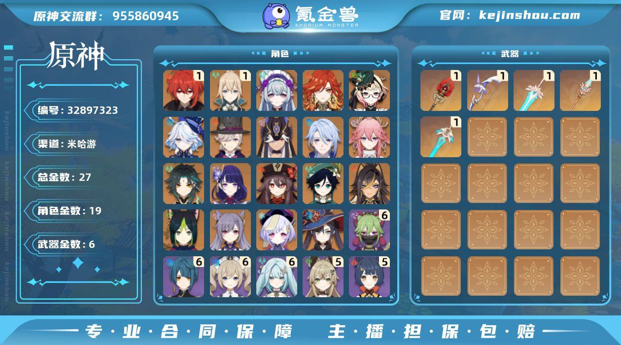 邮箱: 未绑定 总黄数: 27 冒险等级: 58 1命金色角色: 一命迪卢克,一命琴 0命金色角色: 温迪,七七,刻晴,莫娜,魈,胡桃,雷电将军,八重神子,神里绫人,提纳里,赛诺,迪希雅,林尼,芙宁娜,艾梅莉埃,玛薇卡,梦见月瑞希 拥有武器: 阿莫斯之弓,天空之傲,天空之刃,天空之脊,护摩之杖 1精武器: 阿莫斯之弓,天空之傲,天空之刃,天空之脊,护摩之杖