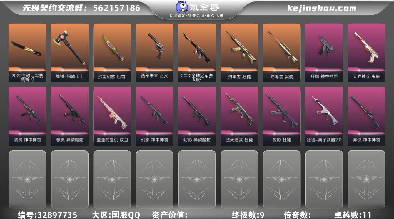 【945937】【套装】:2022全球冠军赛套装,神中神罚套装,异鳞魔蛇套装 【英雄】:幻棱,炼狱,维斯,暮蝶,钛狐,壹决,铁臂,捷风,雷兹,幽影,不死鸟,贤者,猎枭,蝰蛇,零,芮娜,奇乐,尚勃勒,霓虹,斯凯,夜露,星礈,K/O,海神,盖可,黑梦,钢锁 【近战武器】:近战武器-2022全球冠军赛 蝴蝶刀,近战武器-神之刃,近战武器-双生獠牙,近战武器-钢轨卫士 战锤,近战武器-沙尘幻旅 匕首 【狂徒】:狂徒-归零者,狂徒-堕天遗武,狂徒-掠影,狂徒-离子武器//2.0,狂徒-钢轨卫士,狂徒-沙尘幻旅 【幻影】:幻影-2022全球冠军赛,幻影-异鳞魔蛇,幻影-神中神罚,幻影-战术小伙伴 【戍卫】:戍卫-盖亚的复仇,戍卫-钢轨卫士,戍卫-萌彩剪影 【獠犬】:獠犬-胡桃狂想,獠犬-战术小伙伴 【冥驹】:冥驹-归零者,冥驹-胡桃狂想 【飞将】:飞将-沙尘幻旅,飞将-光导纤维 【莽侠】:莽侠-神中神罚 【战神】:战神-萌彩剪影 【奥丁】:奥丁-战术小伙伴 【判官】:判官-萌彩剪影 【骇灵】:骇灵-异鳞魔蛇,骇灵-神中神罚,骇灵-沙尘幻旅,骇灵-光导纤维 【蜂刺】:蜂刺-胡桃狂想,蜂刺-战术小伙伴 【标配】:标配-光导纤维 【正义】:正义-西部未来,正义-沙尘幻旅 【鬼魅】:鬼...