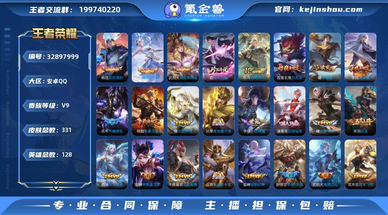 【王者荣耀】珍品无双0 典藏4 无双0 珍品传说1 传说30 史诗97 英雄128 皮肤331 贵族9级 荣耀典藏:武则天|倪克斯神谕|弑枪猎影|最初的交响__珍品传说:朽木白哉__传说皮肤:绛天战甲|炽阳神光|启明星使|地狱火|海洋之心|仲夏夜之梦|久胜战神|黄金狮子座|狄仁杰-超时空战士|黄金射手座|黄金白羊座|猫影幻舞|一念神魔|云鹰飞将|冠军飞将|飞鸢探春|李逍遥|游龙清影|乞巧织情|孙尚香-末日机甲|白虎志|凤求凰|零号·赤焰|天魔缭乱|武陵仙君|武圣|永曜之星|逐花归海|灼幽烈阳|神树通天__稀有限定:奔雷神使|至尊宝|飞衡|蔷薇恋人|神威|烈魂|龙胆|李小龙|梁祝|狮舞东方|暗影游猎|白昼王子|冰锋战神|繁星吟游|凤凰于飞|海滩派对|航海奇遇记|胡桃异想国|皇家上将|混沌棋|狂想玩偶喵|黎明之约|迷踪丽影|魔法小厨娘|魔术师|花木兰-默契交锋|穷奇|驱傩正仪|朔风刀|饕餮|醍醐杖|天狼绘梦者|天狼溯光者|天狼运算者|天狼征服者|万华元夜|无心|纤云弄巧|星空之诺|驯魔猎人|演武夺筹|疑决卦|阴阳师|银河之约|御旌|御銮|御狮|云间偶戏|逐梦之星|暗夜贵公子|暗夜猫娘|暗隐猎兽者|白龙吟|缤纷独角兽|冰冠公主|冰雪圆舞曲|苍穹之光|乘风破浪|大乔-猫狗日记|德古拉伯爵|地狱岩魂|功夫厨神|鬼剑武藏|黄金分...