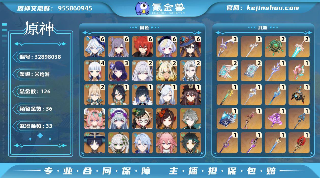 邮箱: 送网易邮箱 总黄数: 126 冒险等级: 60 6命金色角色: 满命迪卢克,满命七七,满命刻晴,满命莫娜,满命芙宁娜 4命金色角色: 四命神里绫华 3命金色角色: 三命雷电将军 2命金色角色: 二命琴,二命那维莱特,二命希诺宁,二命丝柯克 1命金色角色: 一命胡桃,一命申鹤,一命夜兰,一命闲云 0命金色角色: 温迪,枫原万叶,优菈,可莉,达达利亚,钟离,阿贝多,甘雨,魈,珊瑚宫心海,八重神子,神里绫人,提纳里,纳西妲,流浪者,艾尔海森,迪希雅,千织,艾梅莉埃,梦见月瑞希,瓦雷莎 拥有武器: 狼的末路,雾切之回光,四风原典,天空之卷,和璞鸢,阿莫斯之弓,天空之傲,风鹰剑,天空之刃,贯虹之槊,天空之脊,磐岩结绿,护摩之杖,薙草之稻光,苍古自由之誓,终末嗟叹之诗,冬极白星,息灾,神乐之真意,碧落之珑,最初的大魔术,万世流涌大典,金流监督,静水流涌之辉,柔灯挽歌,岩峰巡歌,溢彩心念,苍耀 3精武器: 阿莫斯之弓,风鹰剑 2精武器: 四风原典,天空之卷,天空之傲,碧落之珑 1精武器: 狼的末路,雾切之回光,和璞鸢,天空之刃,贯虹之槊,天空之脊,磐岩结绿,护摩之杖,薙草之稻光,苍古自由之誓,终末嗟叹之诗,冬极白星,息灾,神乐之真意,最初的大魔术,万世流涌大典,金流监督,静水流涌之辉,柔灯挽歌,岩峰巡歌,溢彩心念,苍耀